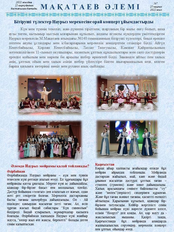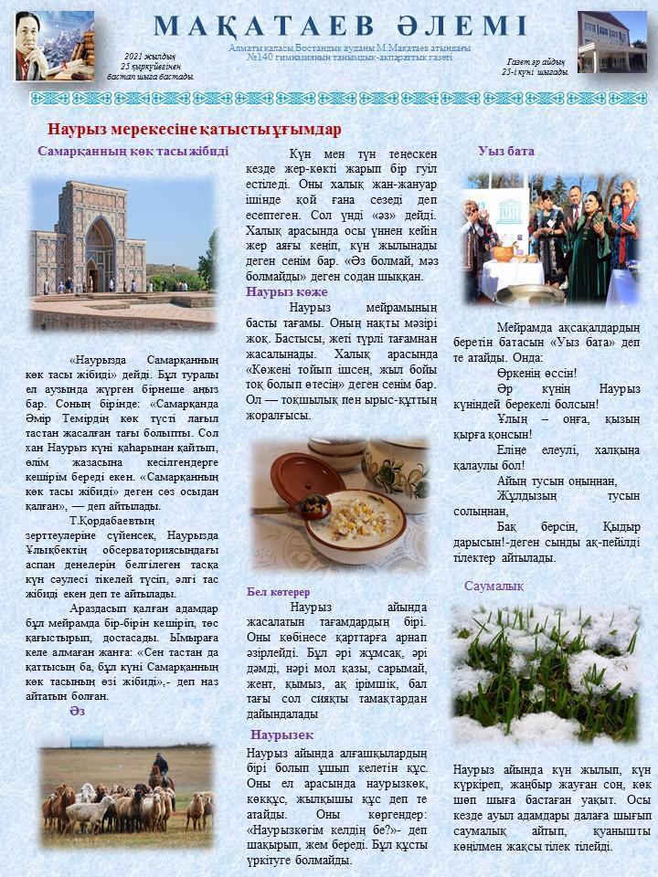 Гимназияның алғашқы "Мақатаев әлемі" атты газеті жарық көрді