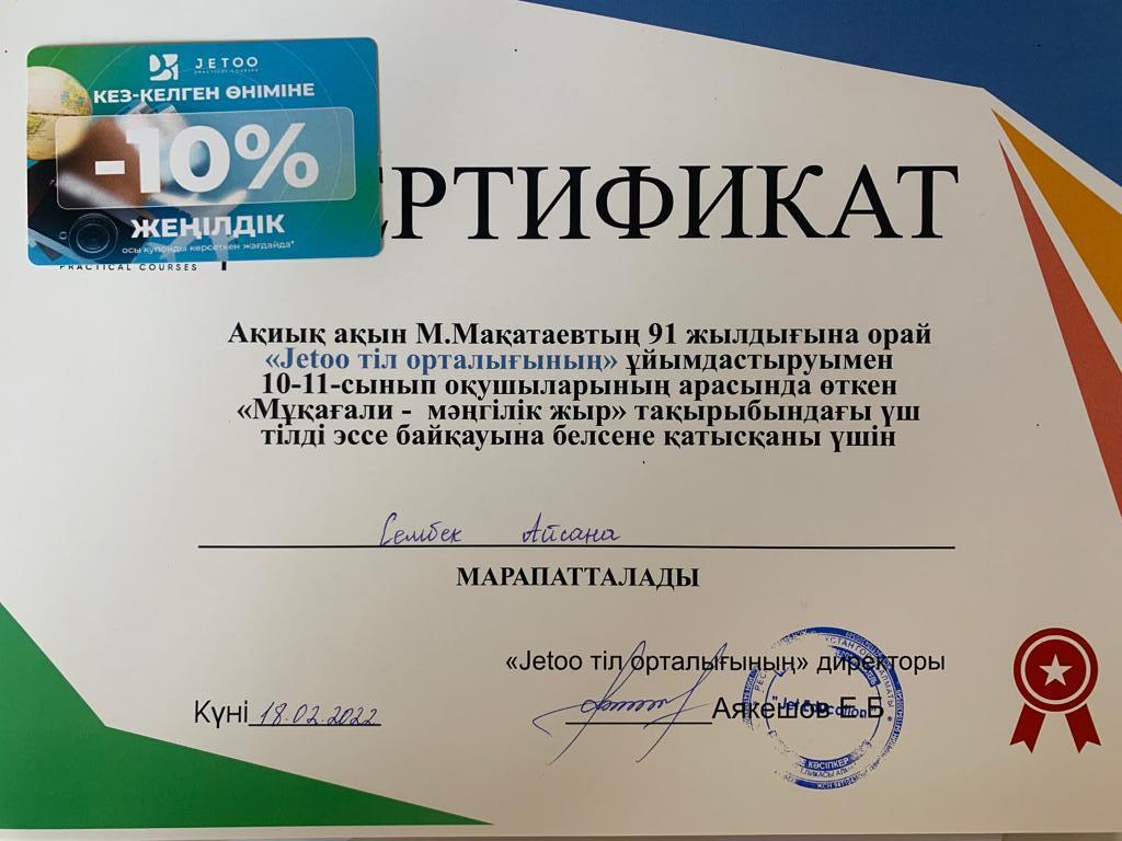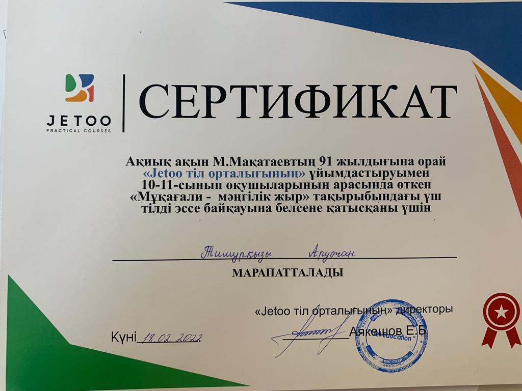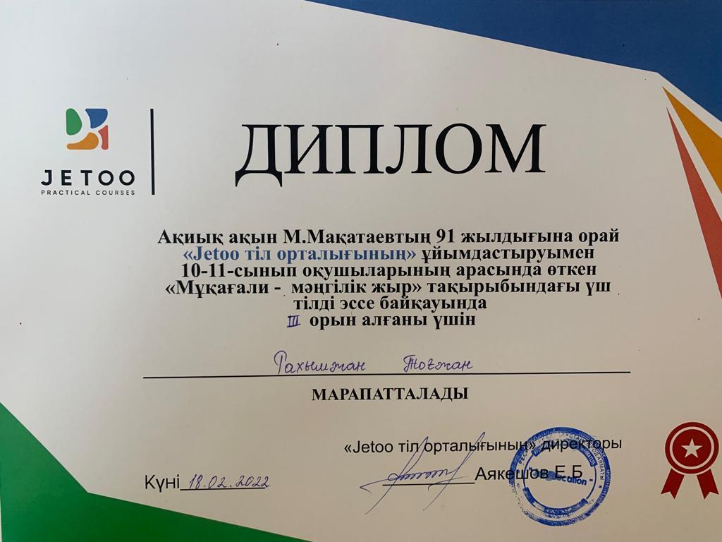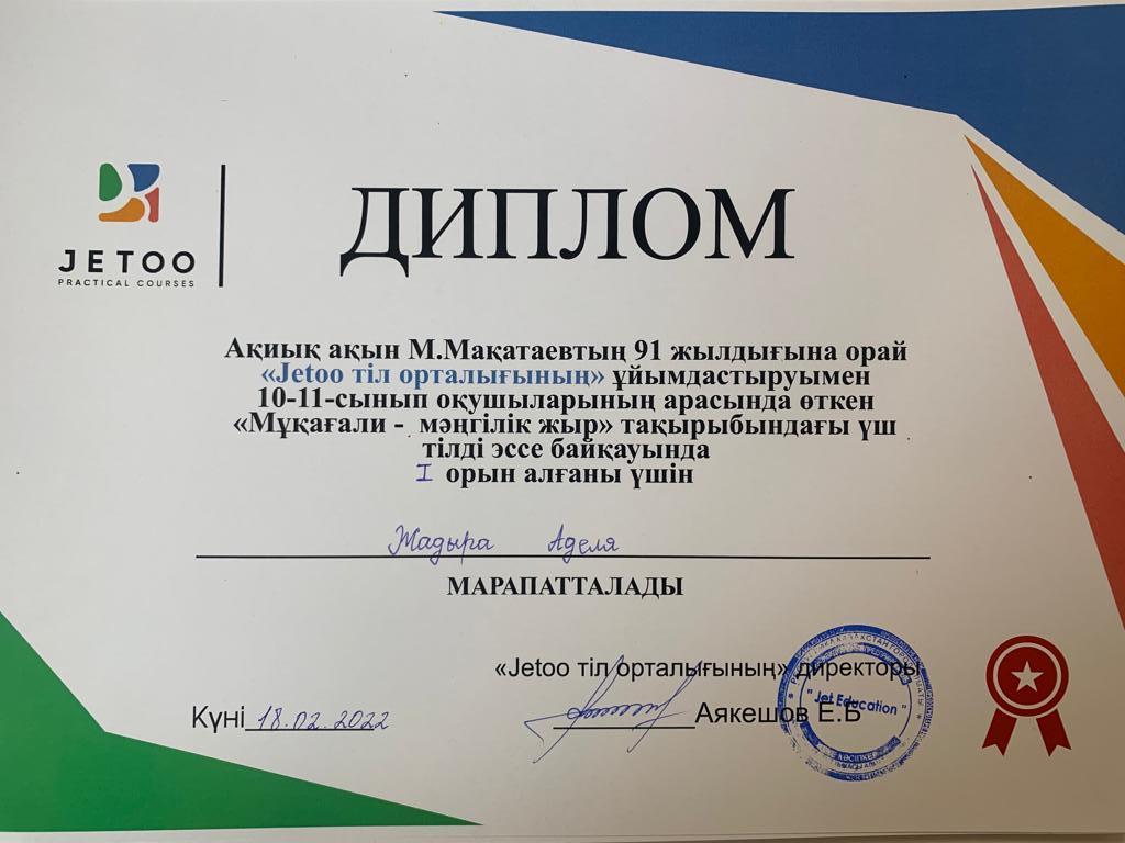 Ақиық ақын М.Мақатаевтың 91 жылдығына орай «Jetoo тіл орталығының» ұйымдастыруымен 10-11-сынып оқушыларының арасында өткен «Мұқағали – мәңгілік жыр» тақырыбындағы үш тілді эссе байқауында Жадыра Аделя І орынмен, Қамбар Назерке ІІ орынмен, Рахымжан Тоғжан ІІІ орынмен марапатталды. Оқу орталығының жүлдегерлерге арнаған ең маңызды сыйлығы кез келген қызметті (тіл үйренуді) тегін ала алады. І орын алған Аделя ағылшын тілін 1 ай тегін үйренуге жолдама алды. Ал Назерке 50% және Тоғжан 30% жеңілдікпен қатыса алады. Қаламдарыңыз ұштала берсін, қыздар. Сіздерге шығармашылық шабыт тілейміз.