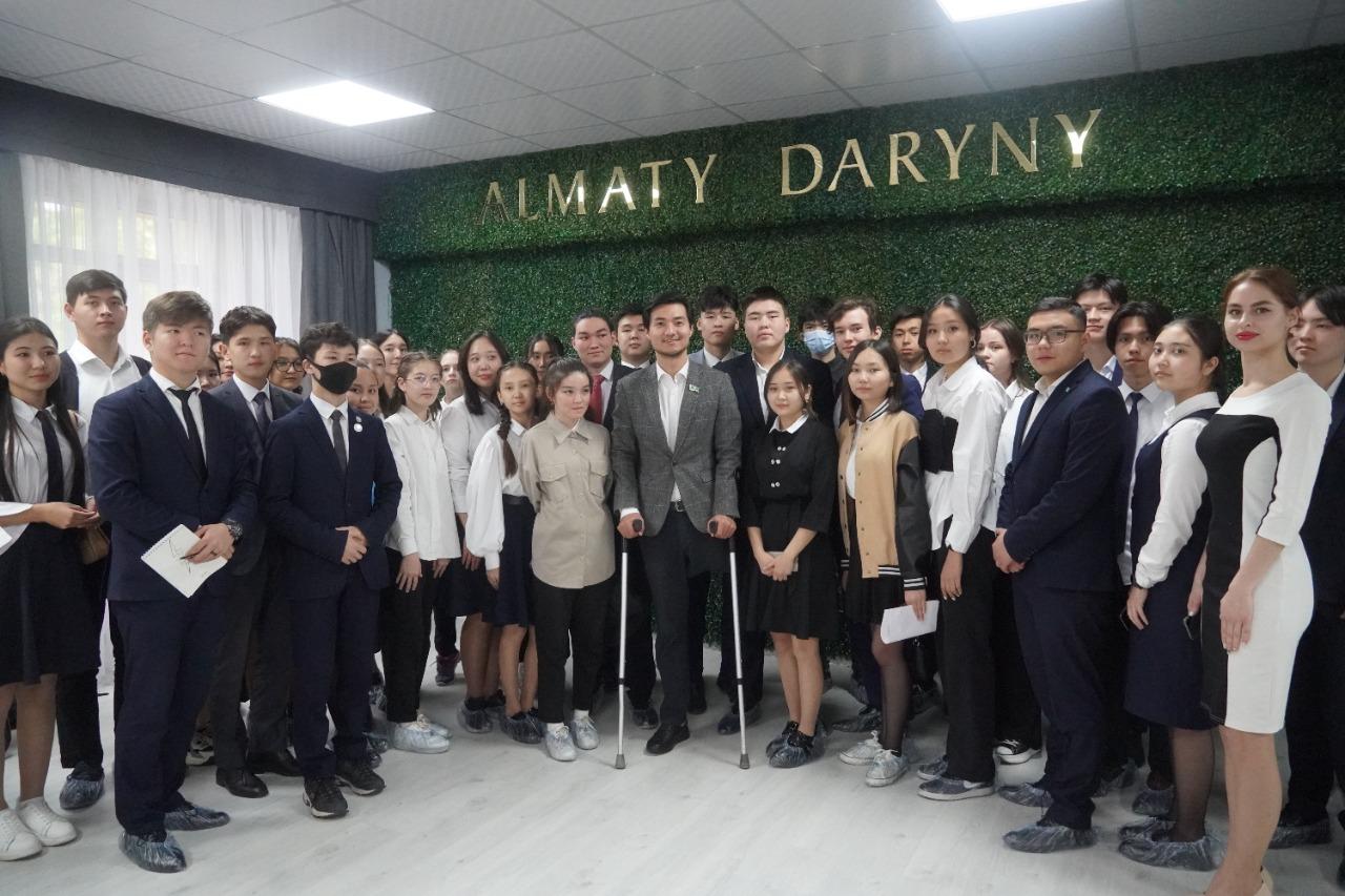 Сәуірдің 27 күні «Алматы дарыны» орталығында «Қазақстандағы 100 есім» жобасының қатысушысы, Алматы қалалық мәслихатының депутаты, Қазақстанның волейбол бойынша жастар құрамының капитаны - Серік Есматовпен кездесу болып өтті. Кездесуге Алматы қаласының мектептерінен дарынды балалар жиналды. Гимназиямыздан 10-сынып оқушысы Дінмұхамед Жігер қатысты. Оқушылар жастайынан екі аяғынан айырылған спортшының өмірімен, жетістіктерімен танысты. Сұрақтар қойылып, жетістікке жетудің жолдары туралы ой бөлісті. Шығармашылығы мен шабытын қатар шыңдап жүрген жас спортшының жігерлі сөздері жиналғандарды қанаттандырды. Кеш мазмұнды сөздермен, әдемі пікірлермен толыға түсті.