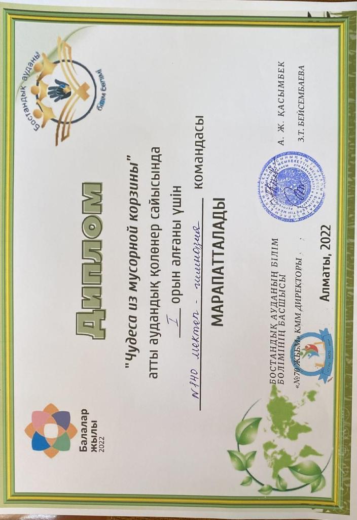 «Чудеса из мусорной корзины» атты аудандық қолөнер сайысында І орын жеңіп алған №140 гимназияның командасын жеңісімен құттықтаймыз. Қолдан жасаған бұйымдарымен көпшіліктің көңілінен шыққан оқушыларымызға өнерлеріңіз өрге жүзе берсін дегіміз келеді.