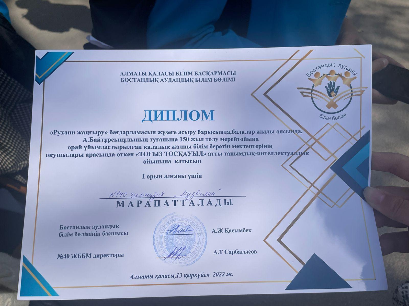 12 сентябрь 2022 100 1 2 3 4 5 "Тоғыз тосқауыл" атты байқау Шәкірттеріміз жарады !!! А. Байтұрсынұлының туғанына 150 жыл толуы мерейтойына орай ұйымдастырылған "Тоғыз тосқауыл" атты байқаудан 1-орын алып, қалалық кезеңге жолдама алды. Құттықтаймыз!!! Осы беттің QR-коды:QR-код этой страницы:
