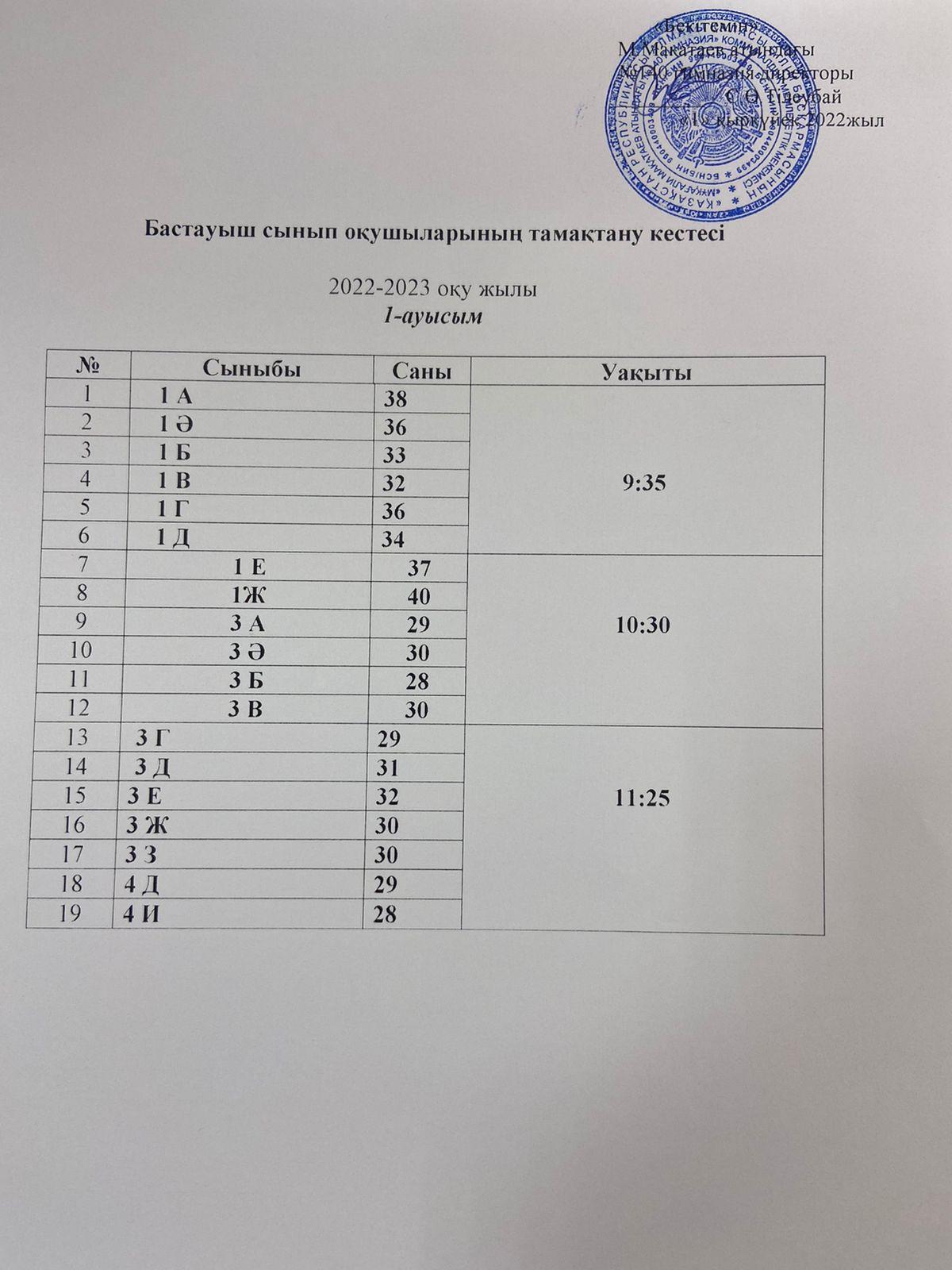 Бастауыш сыныптың тамақтану кестесі 2022 ж
