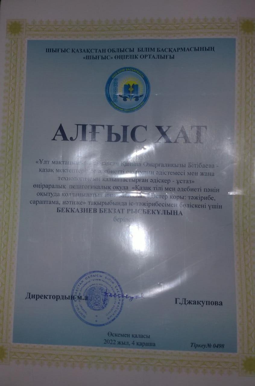 Шығыс Қазақстан облысы білім басқармасының «Шығыс» өңірлік орталығы ұйымының ұйымдастыруымен өткен «Ұлт мақтанышына айналған Қанипа Омарғалиқызы Бітібаева - қазақ мектептерінде әдебиетті оқытудың әдістемесі мен жаңа технологиясын қалыптастырған әдіскер - ұстаз» атты өңіраралық педагогикалық оқуда «Қазақ тілі мен әдебиеті пәнін оқытуда қолданылатын инновациялық әдістер қоры: тәжірибе, сараптама, нәтиже» тақырыбында іс-тәжірибесімен бөліскені үшін алғыс хатпен марапатталған әріптесіміз Бекказиев Бекзат Рысбекұлын құттықтаймыз!