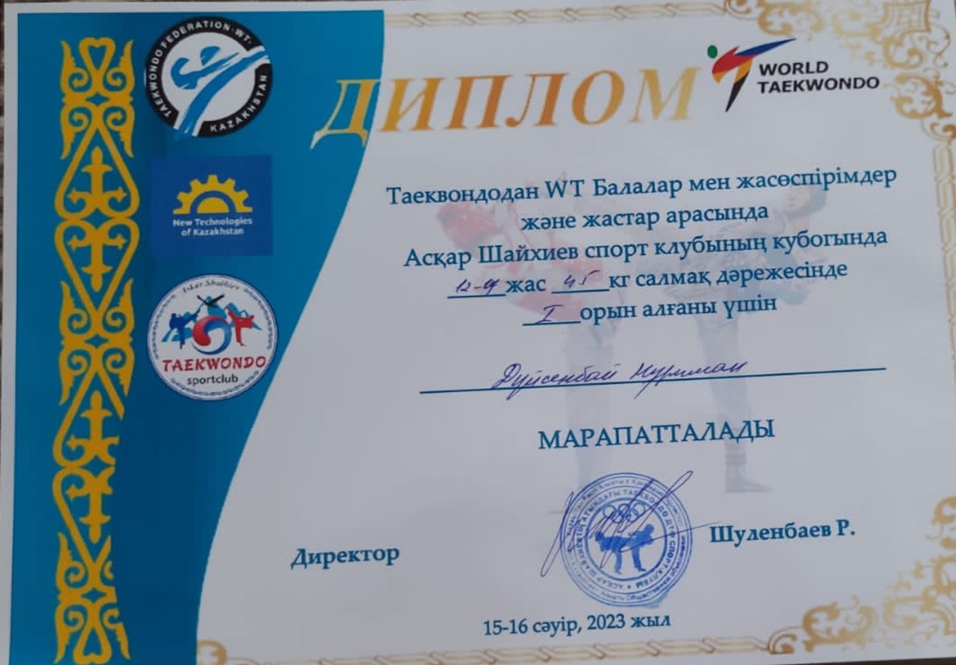 18 апрель 2023 0 1 2 3 4 5 Спорт жетістіктері 6 "Е" сынып оқушысы Дүйсенбай Нұриман таеквондодан WT Балалар мен жасөспірімдер және жастар арасында Асқар Шайхиев спорт клубының кубогына 12-14 жас 45кг салмақ дәрежесінде I орын алды. Құттықтаймыз! Алар асуларың көп болсын! Осы беттің QR-коды:QR-код этой страницы:
