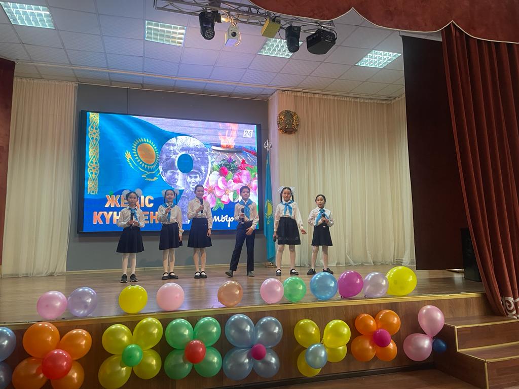 Жеңіс күні мерекесіне орай "Желбіре, жеңіс жалауы!" тақырыбында мектебімізде мерекелік іс-шара өтті. Жеңіс жолында аянбай күрескен батырларымызды еске алып, ерліктеріне алғыс айттық. Шәкірттеріміз ән салып, би билеп, соғыс жылдарынан көрініс қойды.