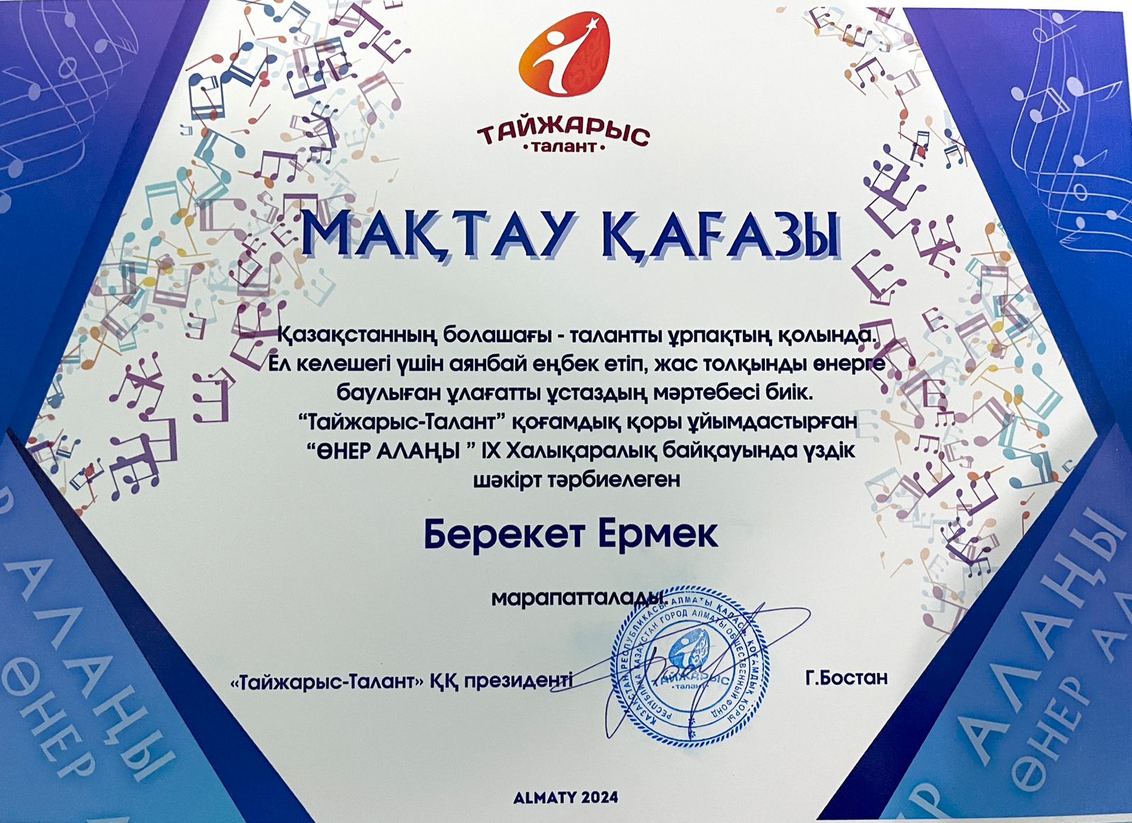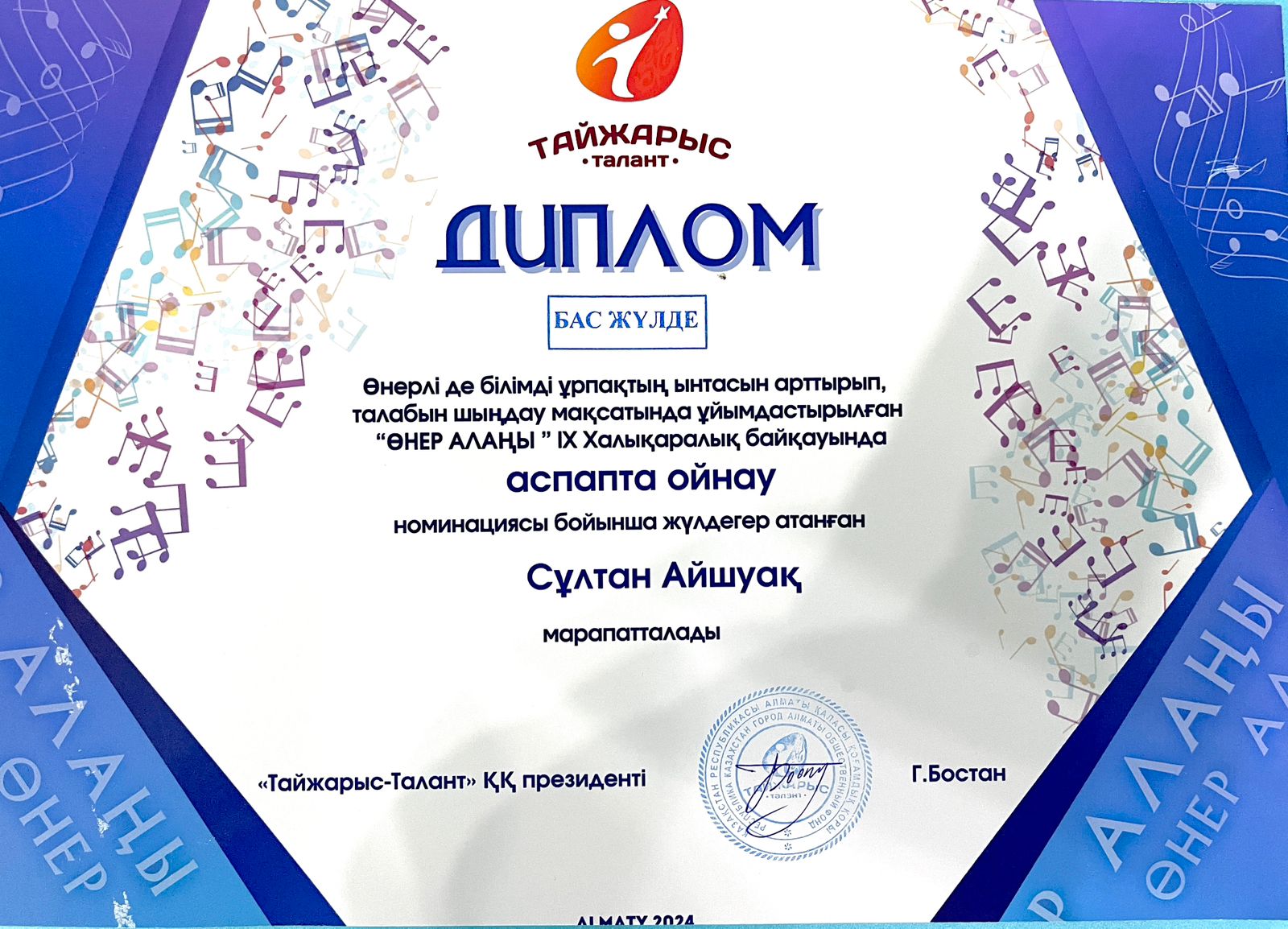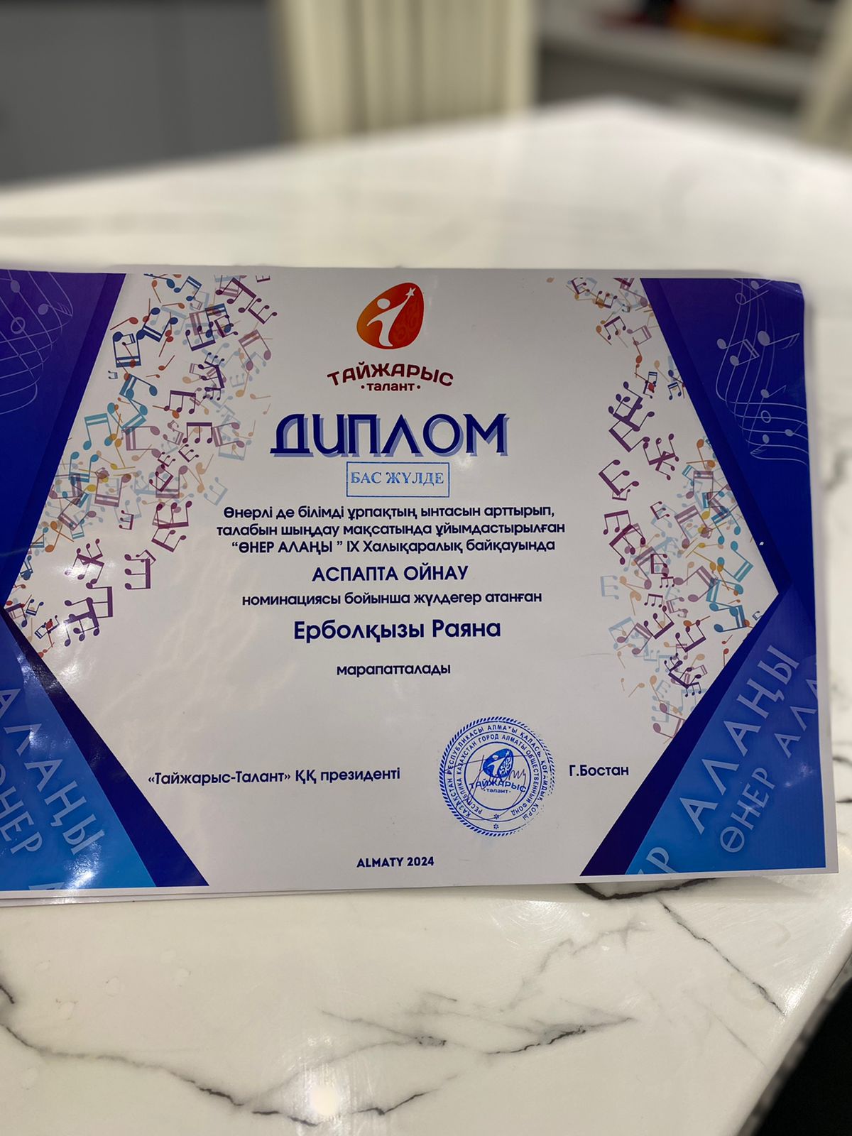 - 5 “В” сынып оқушысы Ерболқызы Раяна “Өнер алаңы” Халықаралық байқауында “Аспапта ойнау” номинациясы бойынша бас жүлдеге ие болды