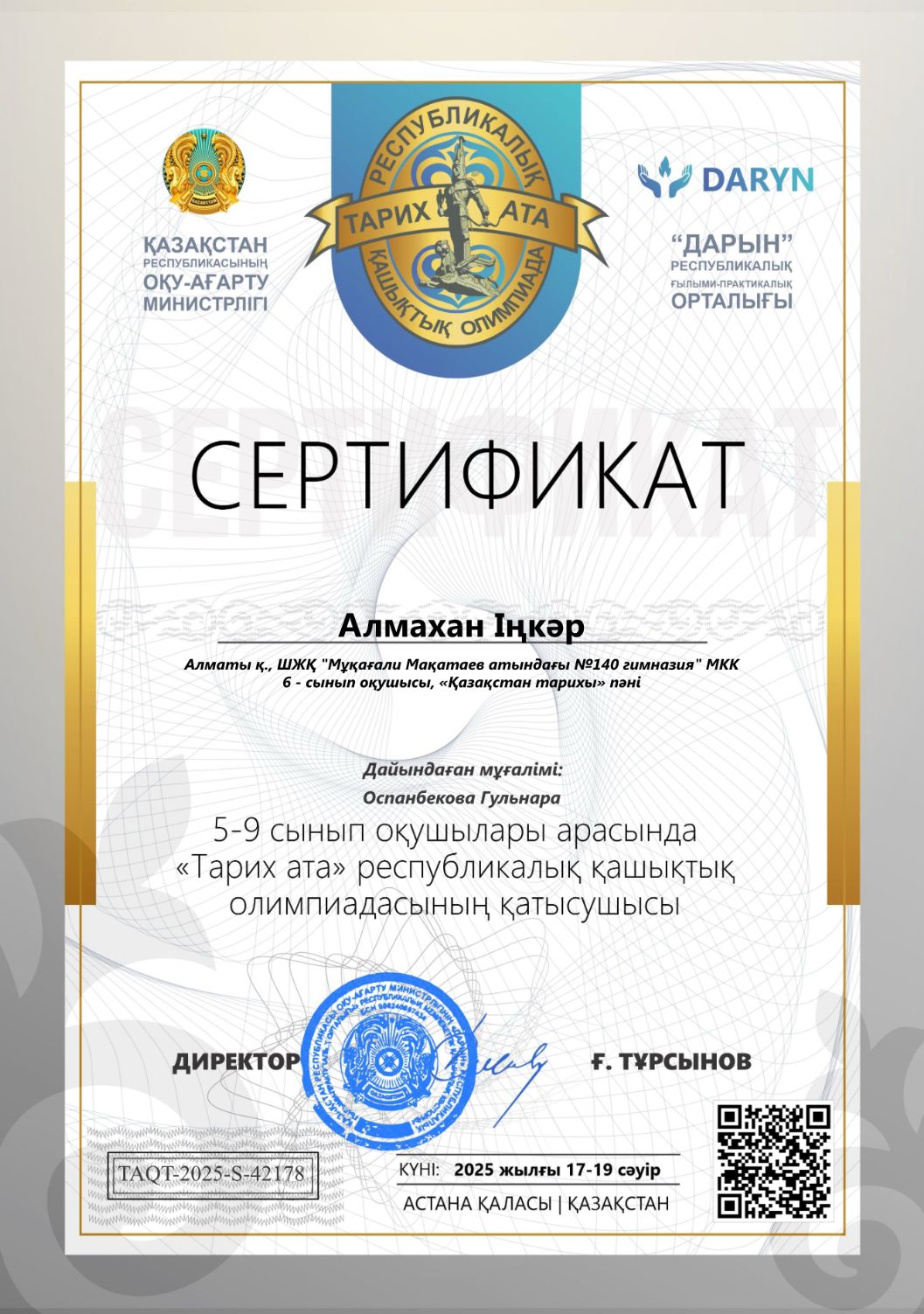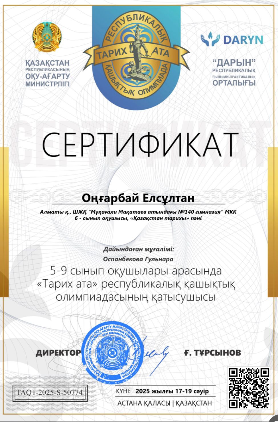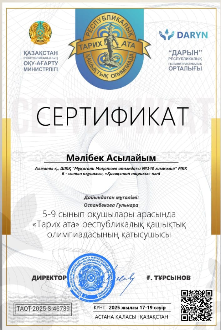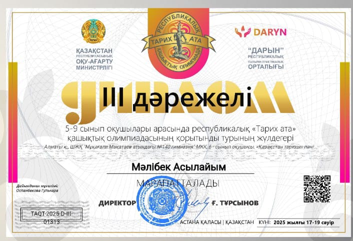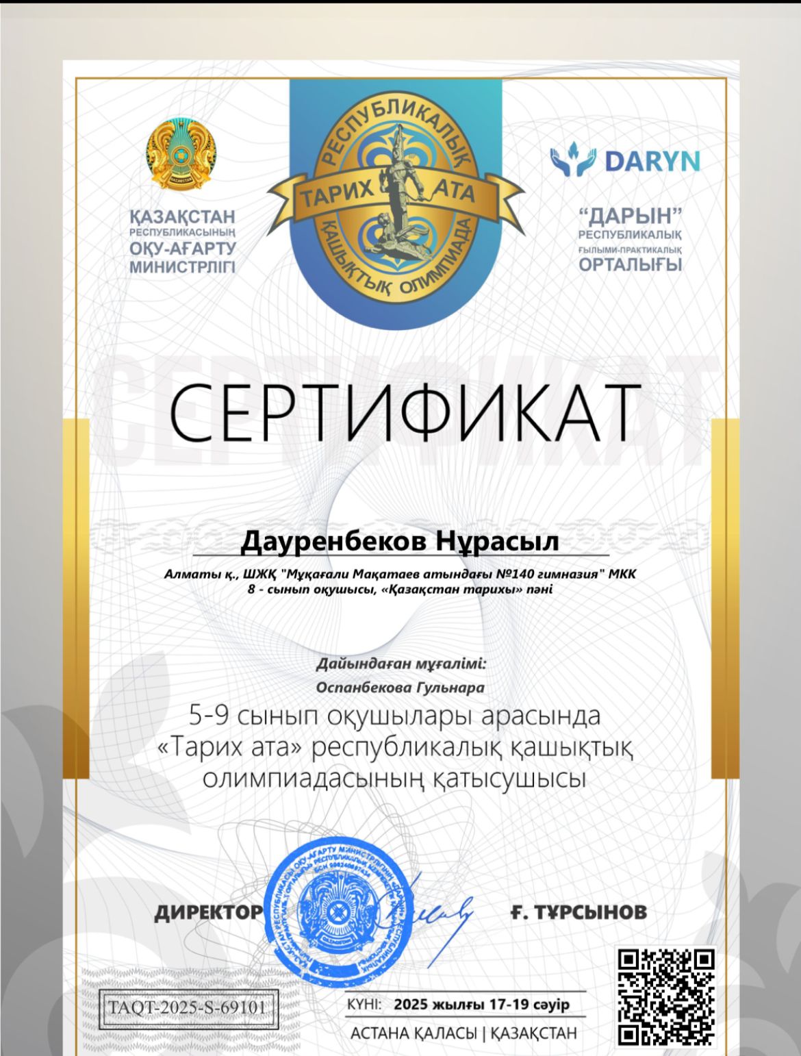 28 апрель 2025 0 1 2 3 4 5 5-9 сыныптар арасында республикалық "Тарих Ата" қашықтық олимпиада жүлдегерлері 5-9 сыныптар арасында республикалық "Тарих Ата" қашықтық олимпиада жүлдегерлері Осы беттің QR-коды:QR-код этой страницы: