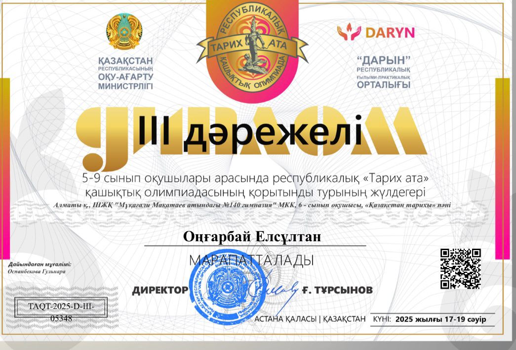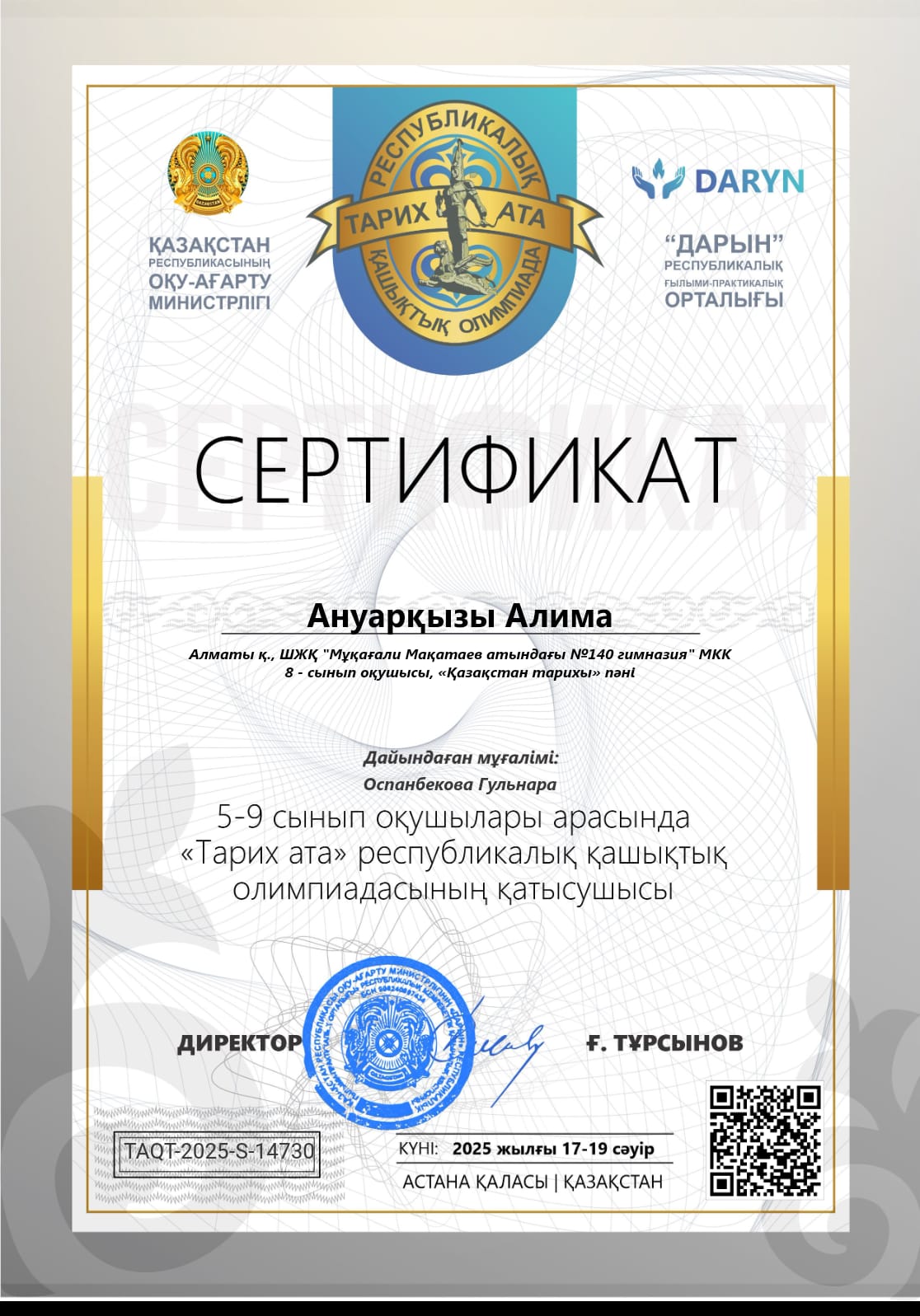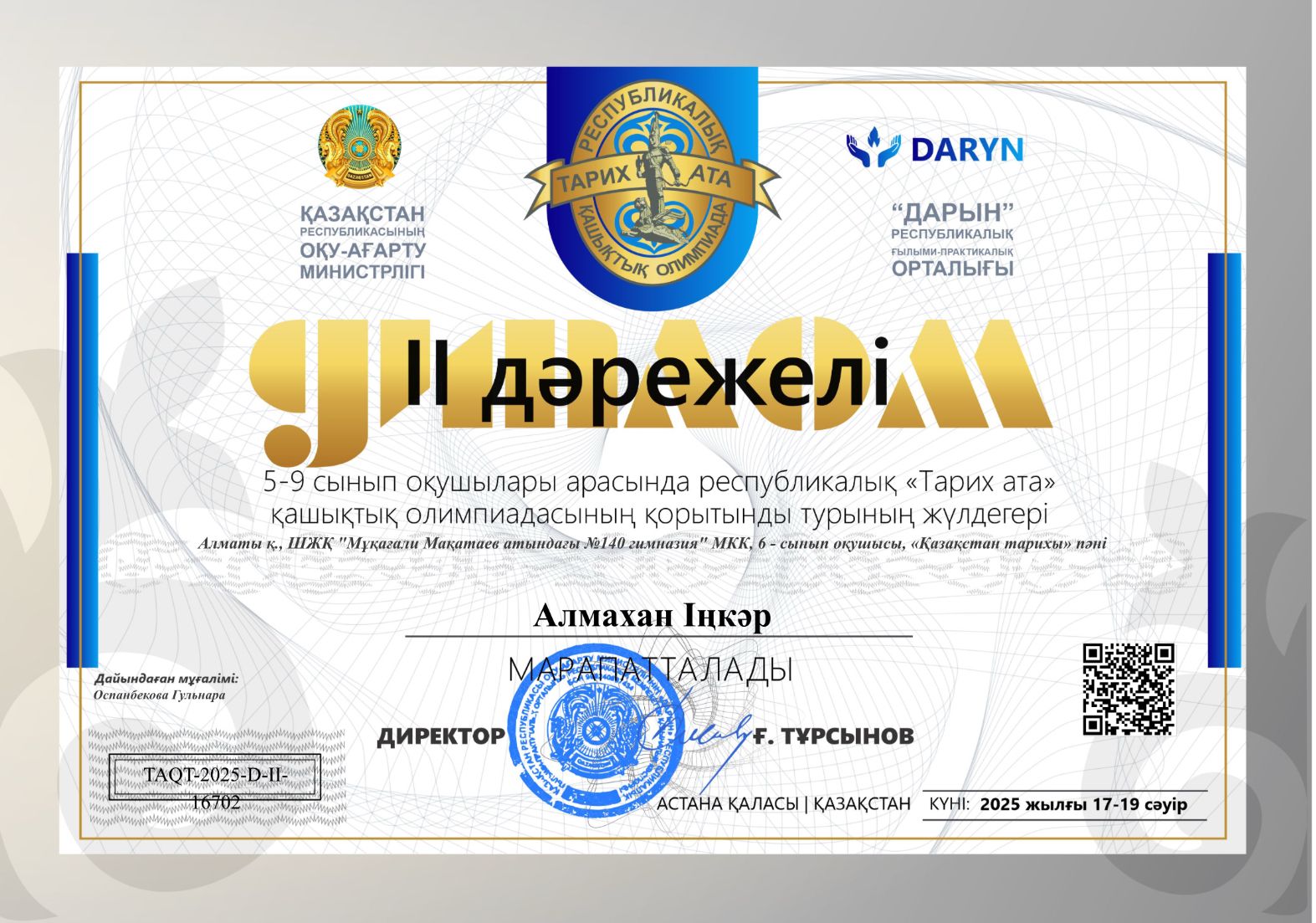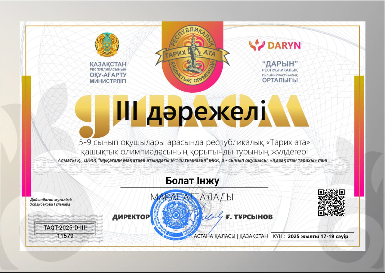 28 апрель 2025 0 1 2 3 4 5 5-9 сыныптар арасында республикалық "Тарих Ата" қашықтық олимпиада жүлдегерлері 5-9 сыныптар арасында республикалық "Тарих Ата" қашықтық олимпиада жүлдегерлері Осы беттің QR-коды:QR-код этой страницы: