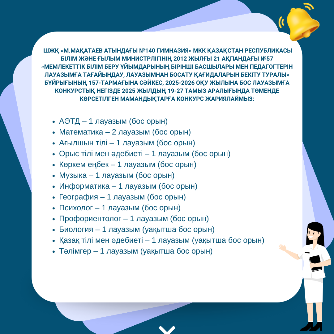 19 август 2025 0 1 2 3 4 5 Педагогтерді бос лауазымға қабылдау Осы беттің QR-коды:QR-код этой страницы:
