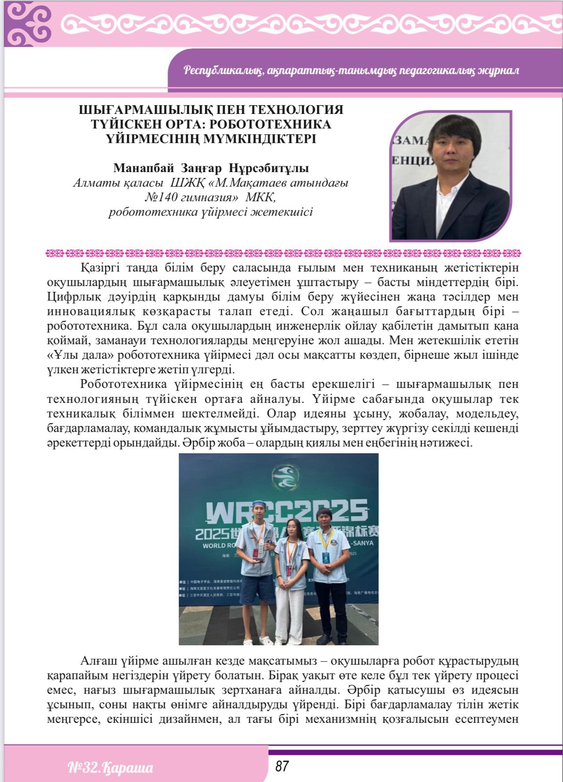 М.Мақатаев атындағы №140 гимназияның робототехника үйірмесінің жетекшісі Манапбай Заңғар Нұрсәбитұлының «Шығармашылық пен технология түйіскен орта: робототехника үйірмесінің мүмкіндіктері» атты мақаласы "Мұғалім мерейі" республикалық ақпараттық-танымдық педагогикалық журналында жарияланды. Бұл мақалада оқушылардың инженерлік ойлауын дамыту, STEM бағытындағы практикалық дағдыларды қалыптастыру, инновациялық жобаларды жүзеге асыру және халықаралық робототехника жарыстарындағы жетістіктері туралы кеңінен баяндалған.