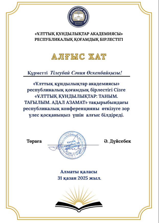 «ҰЛТТЫҚ ҚҰНДЫЛЫҚТАР: ТАНЫМ. ТАҒЫЛЫМ. АДАЛ АЗАМАТ» тақырыбындағы республикалық конференцияны өткізуге қосқан зор үлесі үшін АЛҒЫС ХАТПЕН марапаттады. Ұжым атынан Сәния Өскенбайқызын шын жүректен құттықтаймыз!