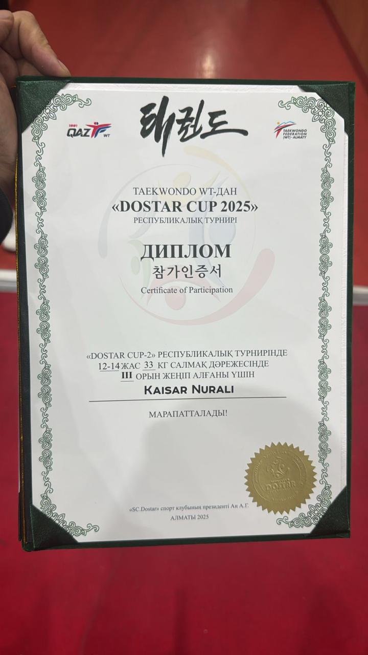 М.Мақатаев атындағы №140 гимназияның 8-сынып оқушысы Қайсар Нұрәли таэквондодан «DOSTAR CUP 2025» республикалық турнирінде III орынды иеленді. Нұрәлиді, ата-анасын, бапкерін құттықтаймыз! Бағындырар биіктерің көп болсын!!!