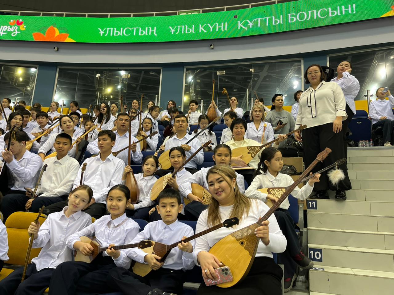 Ауқымды іс-шара барысында оқушылар Қазақстанның еңбек сіңірген қайраткері Асылбек Еңсеповпен бірге Құрманғазының «Балбырауын», Нұрғиса Тілендиевтің «Ата толғауы» күйлерін, Төлеген Мұхамеджановтың «Балалық шақ», Алтынбек Қоразбаевтың «Сағындым Алматымды» шығармаларын орындады.