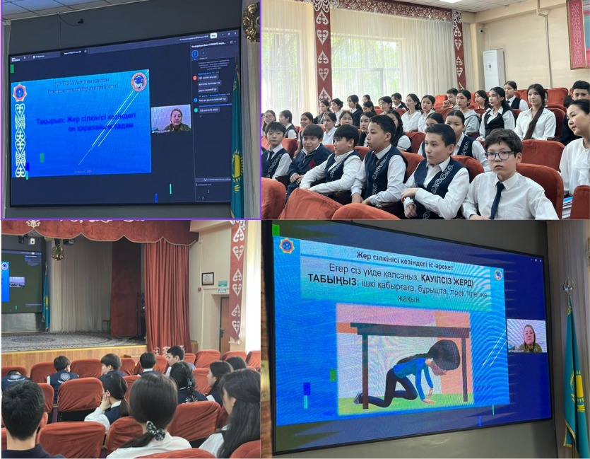ТЖМ қызметкерлері оқушыларға жер сілкінісі кезіндегі қауіпсіз әрекеттер, өзін-өзі қорғау жолдары, сондай-ақ төтенше жағдайда дұрыс әрі жедел шешім қабылдау дағдылары туралы жан-жақты ақпарат берді.