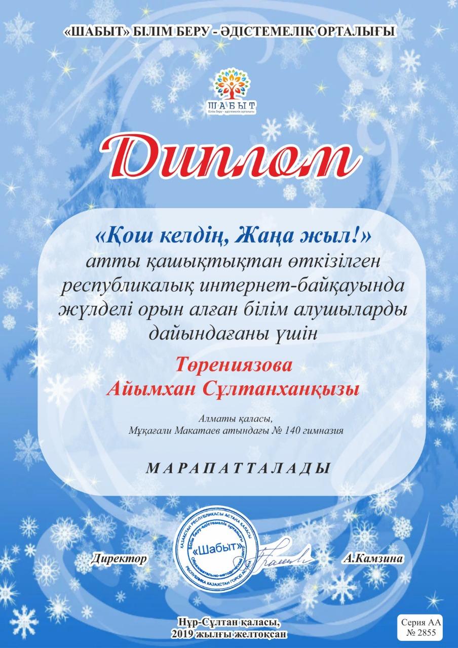 30 декабрь 2019 100 1 2 3 4 5 "Шабыт" білім беру әдістемелік орталығы "Қош келдің, Жаңа жыл!" атты қашықтықтан өткізілген байқаудан шәкірттеріміз жүлделі орыннан көрінді Осы беттің QR-коды:QR-код этой страницы: