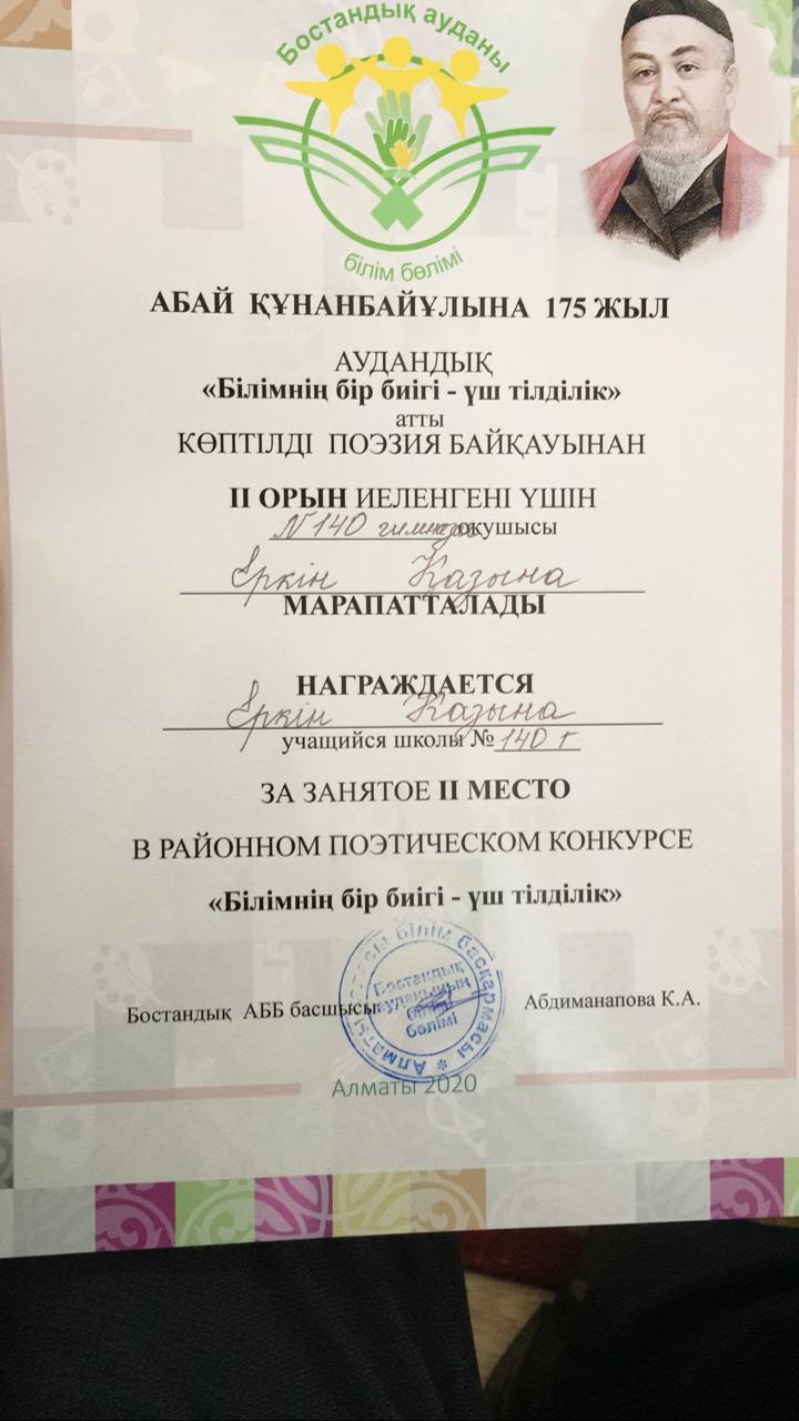 Абай Құнанбайұлының 175 жылдығы аясында №165 лицейде "Білімінің бір билігі - үш тілділік" атты аудандық сайыс болып өтті. Сайыста 10 "Г" сынып оқушысы, шәкіртіміз Еркін Қазына жүлделі орыннан көрініп, қалалық байқауға жолдама алды.