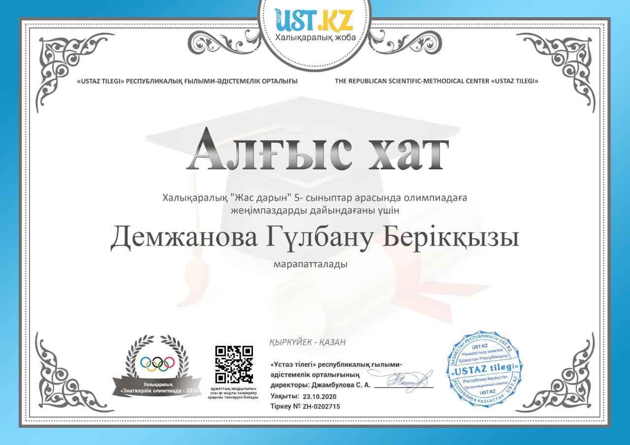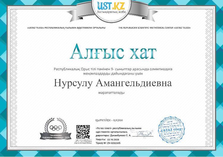 23 октябрь 2020 0 1 2 3 4 5 "USTAZ TILEGI" республикалық ғылыми-әдістемелік орталығы Шәкірттеріміздің жүлделі орынға ие болғандары үшін ұлағатты ұстаздарымыз алғыс хатпен марапатталды. Осы беттің QR-коды:QR-код этой страницы: