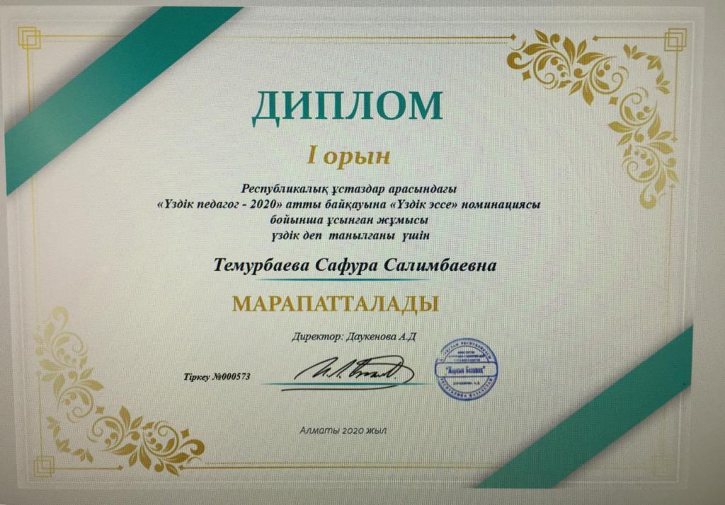 12 декабрь 2020 0 1 2 3 4 5 "Үздік педагог - 2020" Ұстазымыз Сафура Сәлімбайқызы Республикалық ұстаздар арасындағы "Үздік педагог - 2020" атты байқауына "Үздік эссе" номинациясы бойынша ұсынған жұмысы үздік деп танылып, марапатталды. Осы беттің QR-коды:QR-код этой страницы: