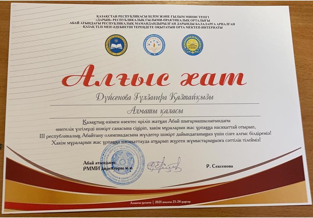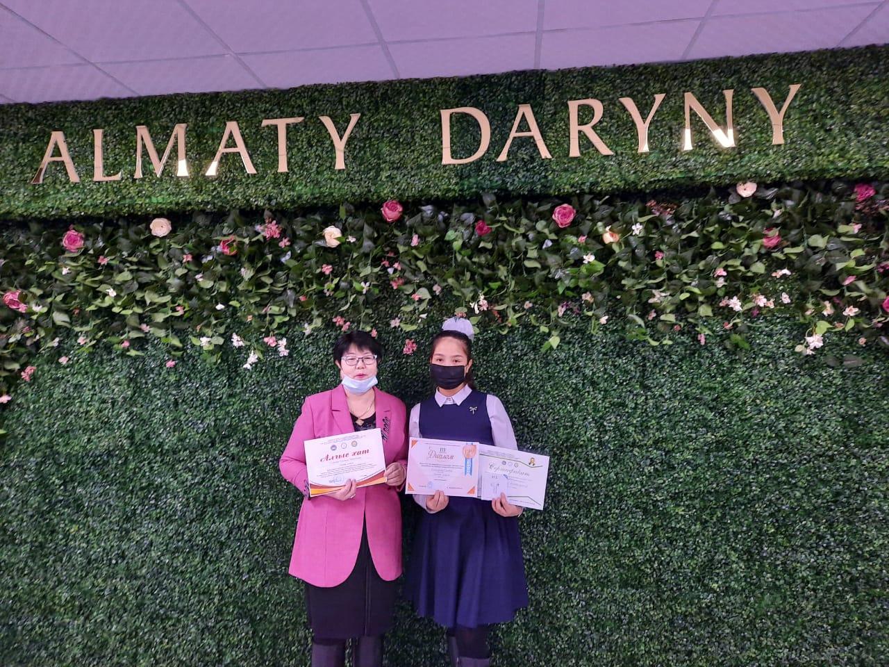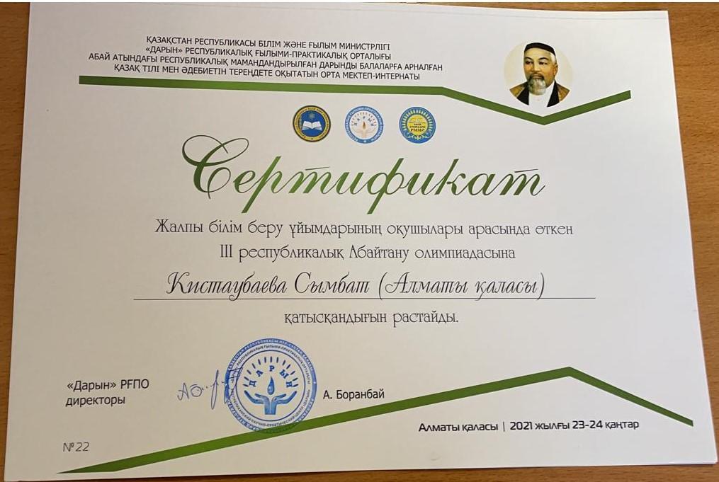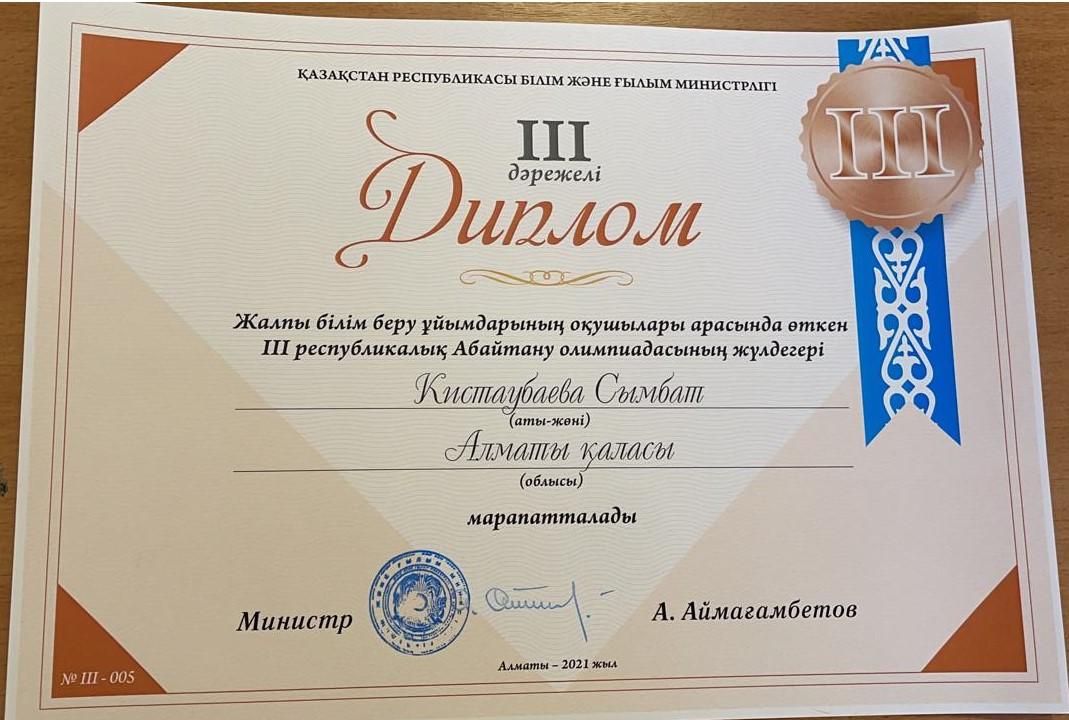 Еліміздің 14 облысы мен 3 қаласынан іріктеліп, жалпы 122 оқушы қатысқан білім додасына, М.Мақатаев атындағы №140 гимназияның, 9-сынып оқушысы, қалалық «Абайтану» олимпиядасының жеңімпазы қатысып, Абайдың қара сөздері мен поэзиясы негізінде дайындалған тақырыптардың біріне эссе жазып, М.Әуезовтің «Абай жолы» романынан берілген үзіндінің қай тарау, бөлімнен алынғанын айтып, мазмұнын жалғастырып әрі роман мазмұнынан «сократтық» сұрақтарына мүдірмей жауап беріп, логикалық деңгейі тексерілген екі айналымдық сайыста, үздік білімі мен жазу шеберлігін көрсете білген - Кистаубаева Сымбат, ІІІ дәрежелі диплом мен сертификат иегері атанып, сыйлыққа дыбыс ұлғайтқыш алды.