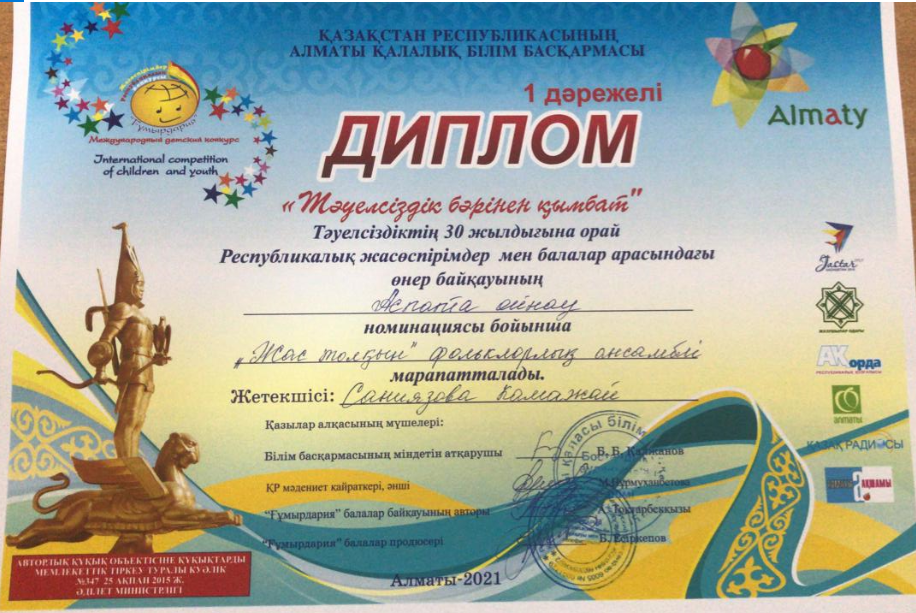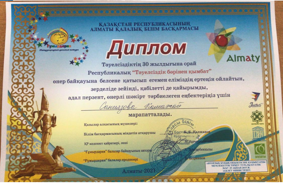 Өнер байқауына белсене қатысып, егемен еліміздің ертеңін ойлайтын зерделі де зейінді, қабілетті де қайырымды, адал перзент, өнерлі шәкірт тәрбиелеген ұстаздарымыз: Тұяқбаев Бекзат Мұхамедрайымұлы мен Саниязова Қамажай «Үздік ұстаз» дипломымен марапатталды.