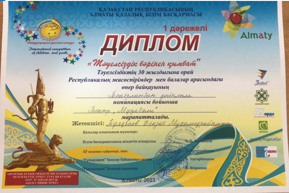 Тәуелсіздіктің 30 жылдығына орай «Тәуелсіздік бәрінен қымбат» Республикалық жасөспірімдер мен балалар арасындағы қашықтықтан ұйымдастырылған өнер байқауына «Театрланған қойылым» бойынша М.Мақатаев атындағы №140 гимназиямыздың «Мұқағали» театры, «Аспапта ойнау» номинациясы бойынша «Жас толқын» фольклорлық ансамблі қатысты. Жоғары деңгейде өнер көрсеткен өнерпаздарымыз жүлделі І дәрежелі диплом иегерлері атанып, мектебіміздің мәртебесін тағы да асқақтата түсті.