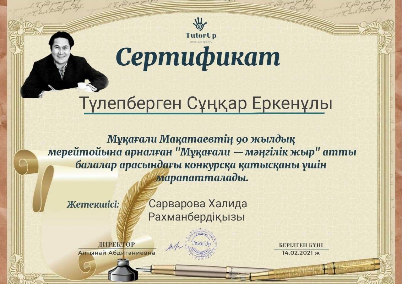 М.Мақатаев атындағы №140 гимназиямыздың талапты әрі алғыр шәкірті - Түлепберген Сұңқар Еркенұлы, Tutor Up білім беру орталығы 14.02.2021ж ұйымдастырған Мұқағали Мақатаевтың 90 жылдық мерейтойына арналған «Мұқағали – мәңгілік жыр» атты балалар арасындағы конкурсқа қатысып, сертификат иегері атанса, Республикалық «Жас Дарын» және «ӨРЛЕУ» порталдарының ұйымдастыруымен Қазақтың ұлы ақыны Мұқағали Мақатаевтың 90-жылдығына орай ұйымдастырылған ақынның өлеңдерін мәнерлеп оқу шығармашылық байқауына қатысып, «Өлең сөздің патшасы» номинациясында үздік нәтиже көрсеткені үшін І дәрежелі дипломмен марапатталды.