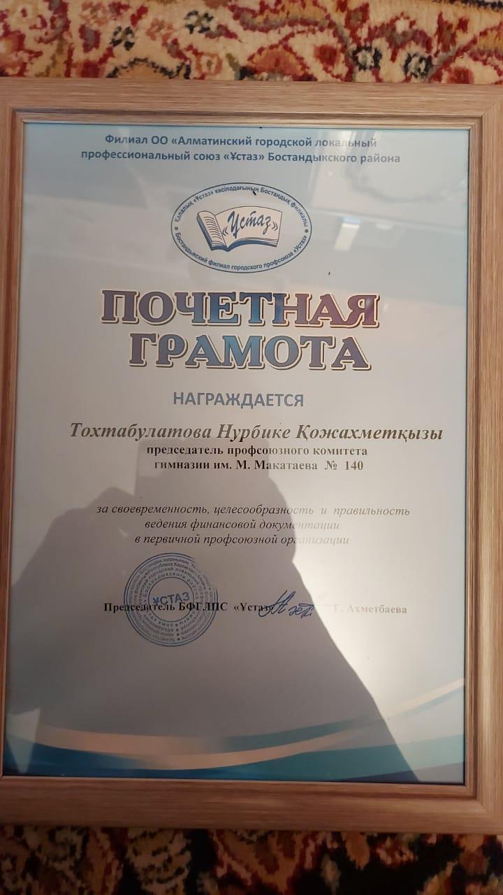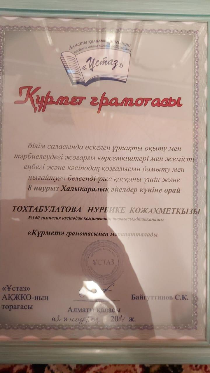 Білім беру саласында өскелең ұрпақты оқыту мен тәрбиелеудегі жоғарғы көрсеткіштері мен жемісті еңбегі және кәсіподақ қозғалысын дамыту мен нығайтуға белсенді үлес қосқаны үшін сонымен қатар, 8 наурыз Халықаралық әйелдер күніне орай М.Мақатаев атындағы №140 гимназиямыздың кәсіподақ комитетінің төрағасы, кітапханашы – Тохтабулатова Нұрбике Қожахметқызы «Құрмет грамотасымен» марапатталды.