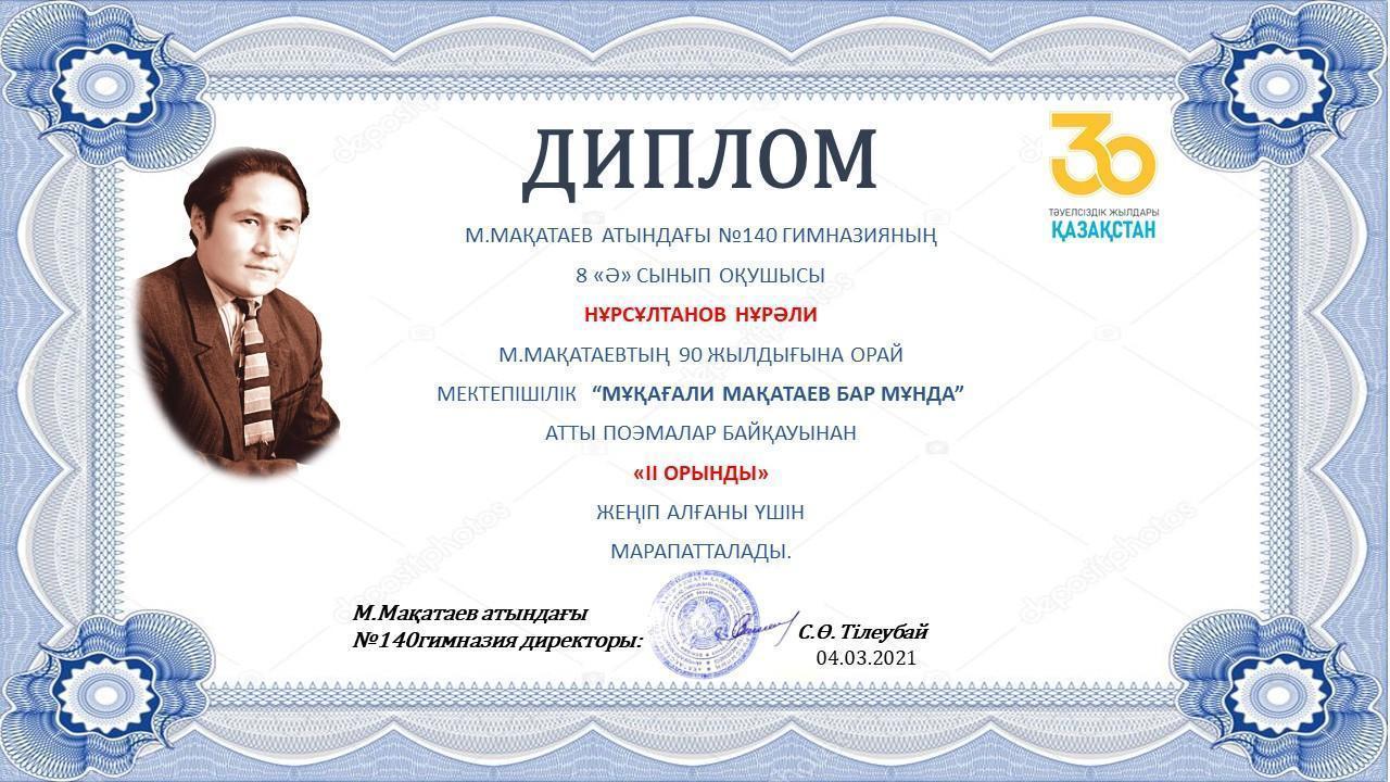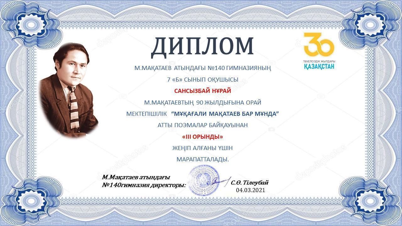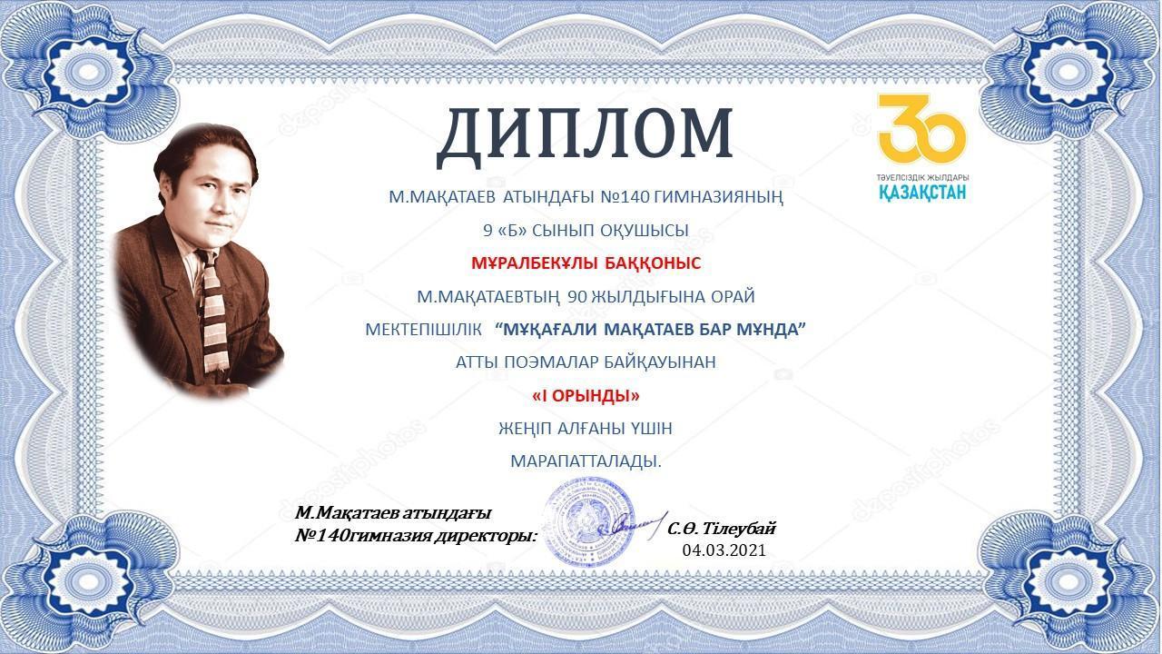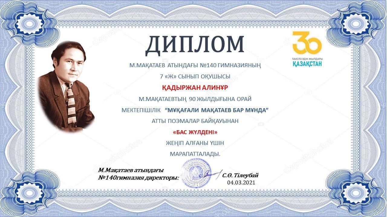 23.02.2021ж. 7-10 сынып аралығында ”Мұқағали Мақатаев бар мұнда” атты поэмалар байқауы өтті . Оқушылар ақын шығармашылығындағы «Райымбек, Райымбек», «Аққулар ұйықтағанда» поэмаларының бірін мәнерлеп жатқа оқыды. ІІ кезең бірінші кезеңнен мүдірмей өткен оқушылар арасында эстафеталық сайыс түрінде өткізілді. Тұяқбаев Бекзат, Нусипхан Гүлнәз төрелік еткен байқау өз деңгейінде, жоғары дәрежеде өтті. Оқушылар әділ бағаланып, марапаттарына ие болды.