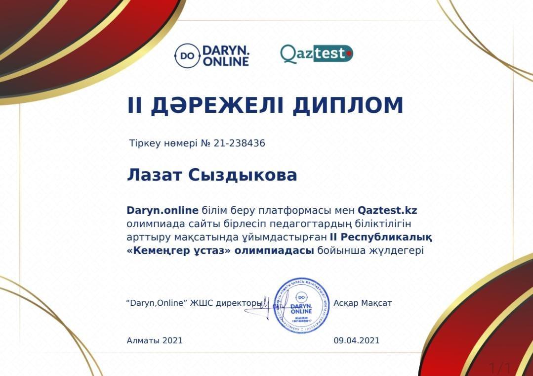 Дарын онлайн білім беру платформасы мен Қазтест олимпиада сайты бірлесіп педагогтардың біліктілігін арттыру мақсатында ұйымдастырған ІІ Республикалық «Кемеңгер ұстаз» олимпиадасында М.Мақатаев атындағы №140 гимназияның ұлағатты ұстазы Ляззат Сыздыкова ІІ дәрежелі дипломмен марапатталды.
