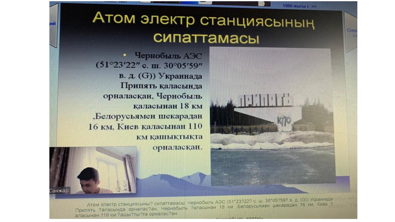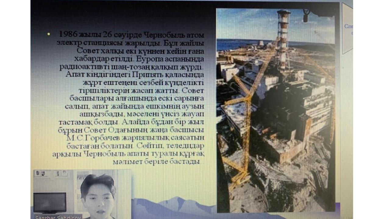 Биыл Чернобыль атом электростанциясындағы ядролық апаттың орын алғанына 35 жыл толып отыр. Осыған орай М. Мақатаев атындағы №140 гимназияда 7 сыныптар арасында онлайн дөңгелек үстел өтті. Дүниежүзіндегі атом энергетикасы тарихындағы ең ірі жарылыстың зардабын жоюға 800 мыңдай адам қатысса, оның 32 мыңы қазақстандық еді. КСРО құрамына кіретін 15 республикадан әскерилер мен партизандық қызметке қосымша күштер тартылды. Олардың ішінде қазақстандық азаматтар да бар еді. Алайда атом станциясынан жайылған радиация ешкімді тірі қалдырмады. Алғашқы күндері жақын жұмыс жасаған барлық адамдарды жалмады. Қаланың халқын басқа региондарға көшірді.