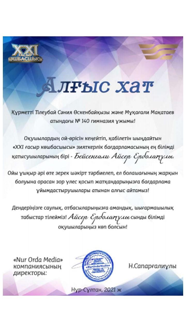 Хабар агенттігінің қолдауымен ұйымдастырылған, оқушылардың ой-өрісін кеңейтіп, қабілетін шыңдайтын "ХХІ ғасыр көшбасшысы" зияткерлік бағдарламасына қатысып, білімі, алғырлығымен көптің көңілінен шыққан гимназиямыздың сегіз қырлы бір сырлы шәкірті - Бейсенғали Айсер Ерболатұлы. Ойы ұшқыр әрі өте зерек шәкірт тәрбиелеп, ел болашағының жарқын болуына орасан зор үлесін қосып жатқан М.Мақатаев атындағы №140 гимназия ұжымы мен басшысы Тілеубай Сәния Өскенбайқызы, бағдарлама ұйымдастырушыларының арнайы алғыс хатымен марапатталды.