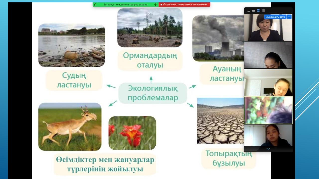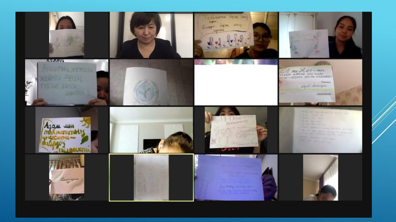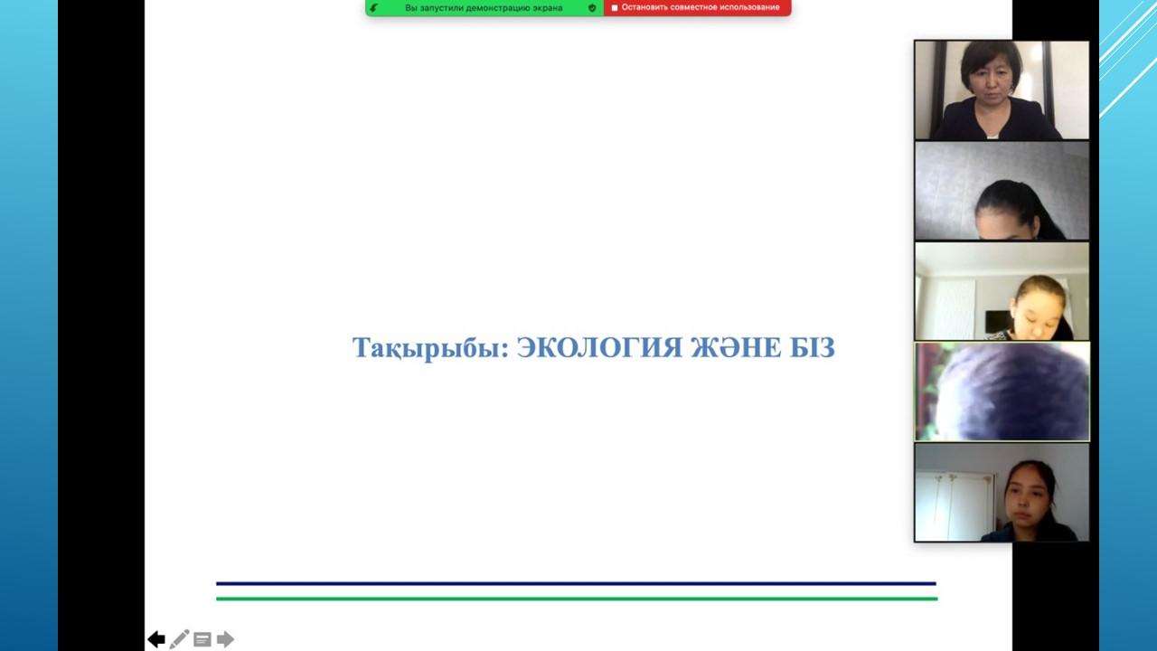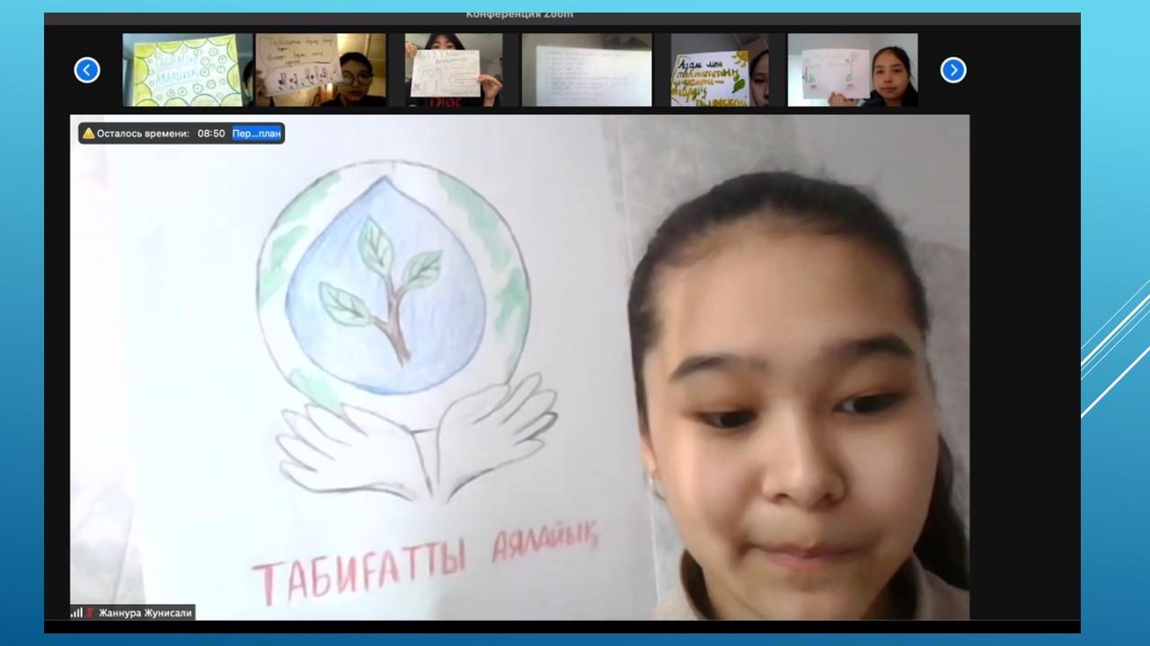 Табиғатты түсіну аясында экологиялық проблемалардың болатынын ұғындыра отырып, оны қорғауға , үнемдеуге, аялауға үндеу әрі судың ластануына , өсімдіктің жойылуына , орманның оталуына адамның тікелей әсері бар екенін ұғындыру мақсатында пән мұғалімдері мен Түстікбаева Құралай апайдың жетекшілігімен 30.04.2021ж. күні 8-10 сыныптар арасында "Экология және біз" тақырыбында қорытынды дәрістер өткізілді. Конференцияч барысында түрлі экологиялық жағдайларды талдап, оқушылар да өзіндік ойларын білдірді.