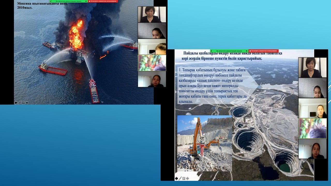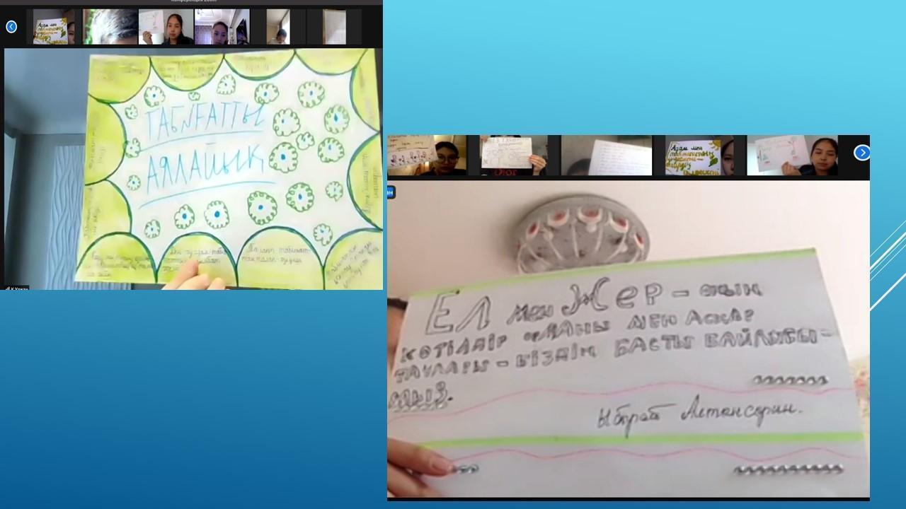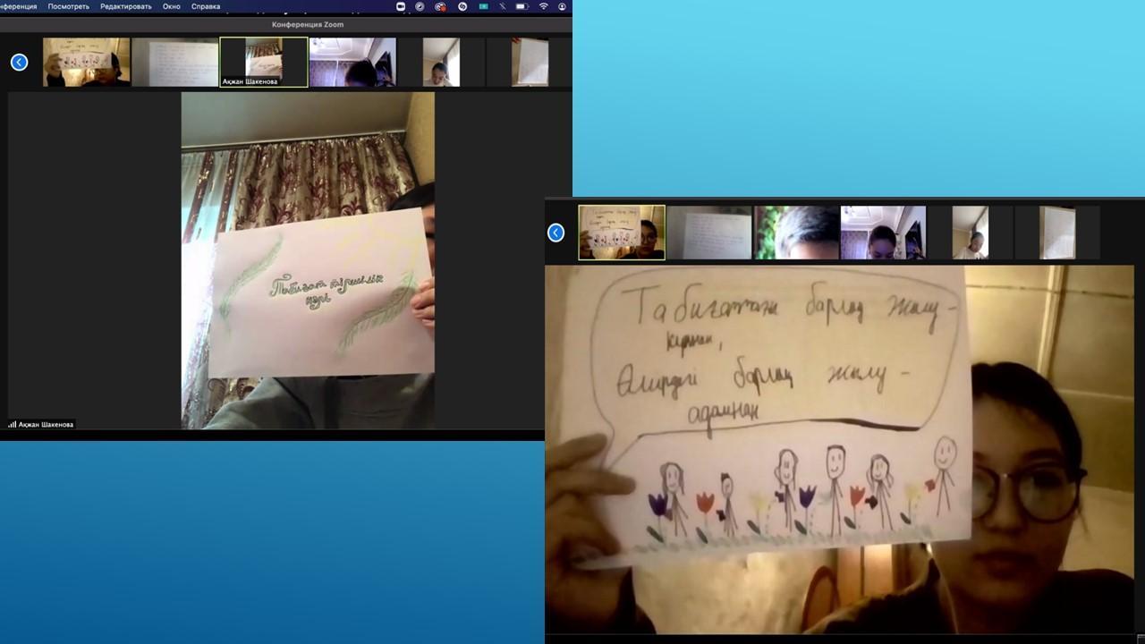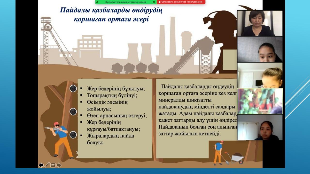 Табиғатты түсіну аясында экологиялық проблемалардың болатынын ұғындыра отырып, оны қорғауға , үнемдеуге, аялауға үндеу әрі судың ластануына , өсімдіктің жойылуына , орманның оталуына адамның тікелей әсері бар екенін ұғындыру мақсатында пән мұғалімдері мен Түстікбаева Құралай апайдың жетекшілігімен 30.04.2021ж. күні 8-10 сыныптар арасында "Экология және біз" тақырыбында қорытынды дәрістер өткізілді. Конференцияч барысында түрлі экологиялық жағдайларды талдап, оқушылар да өзіндік ойларын білдірді.