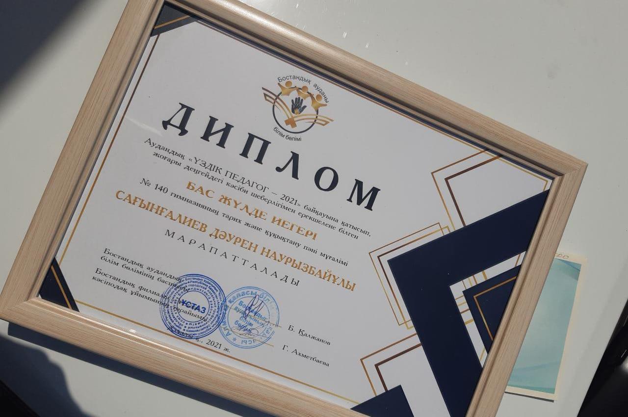Гимназияның дарынды ұстазы Дәурен Наурызбайұлы - білім саласындағы көлеңкелі деген тұстарын көре білетін әрі күрмеуі қиын өзекті мәселелердің шешімін табуға үнемі талпынып жүретін дарынды жастардың бірі. Нағыз кәсіби педагогтарға тән әрекет ете білетін ойы терең, мәдениеті жоғары, ниеті адал, оқыту мен тәрбиелеуде инновациялық бағытта жұмыс жасай білетін, өзіндік «мені» қалыптасқан дара тұлға, жақында өткен аудандық «Үздік педагог – 2021» байқауында, жоғарғы деңгейдегі кәсіби шеберлігін көрсетіп, бас жүлде иегері атанды. Алматы қаласы Білім басқармасының Құрмет грамотасымен марапатталған Сағынғалиев Дәурен Наурызбайұлын, аталмыш жеңісімен құттықтаймыз.