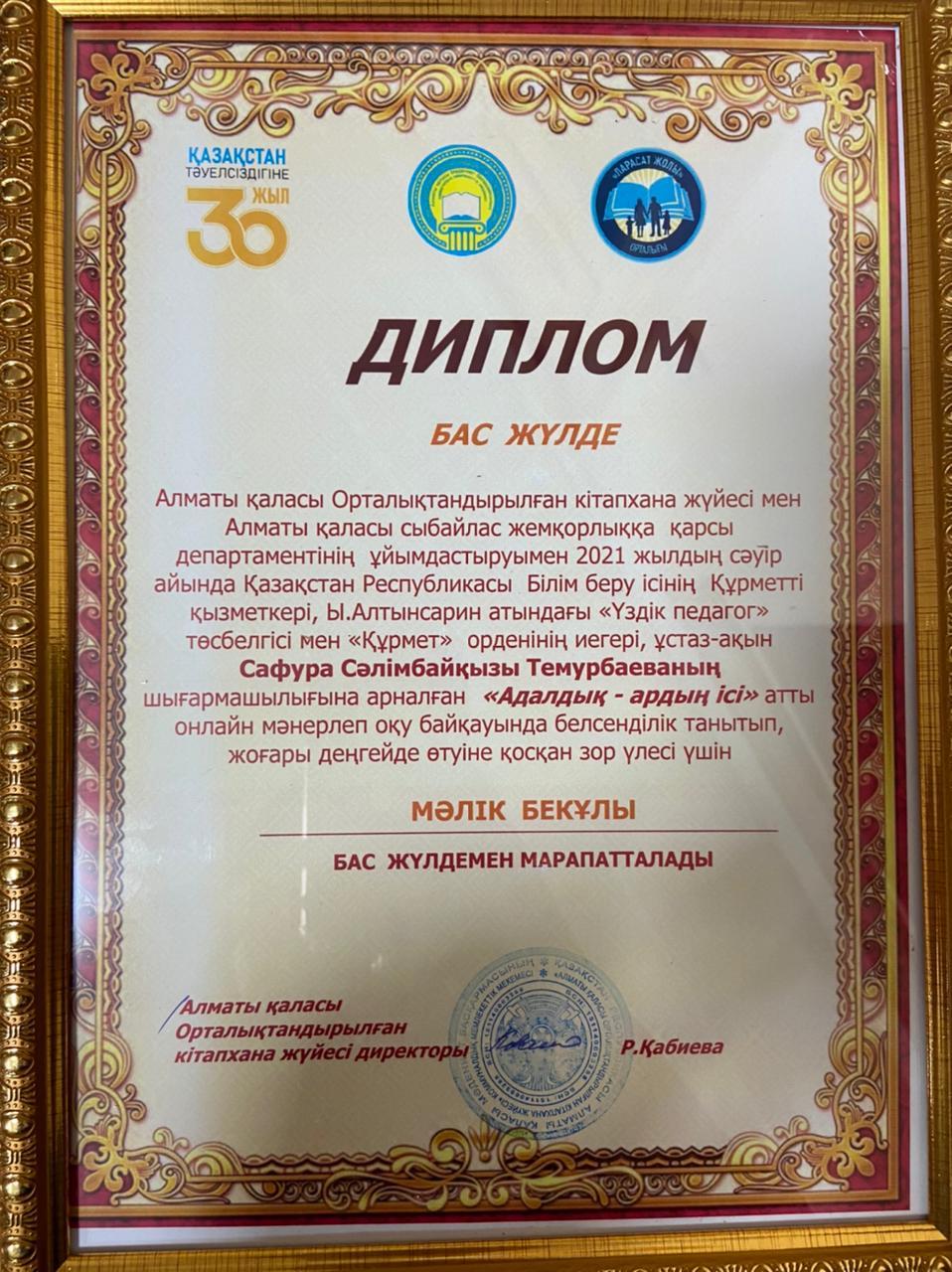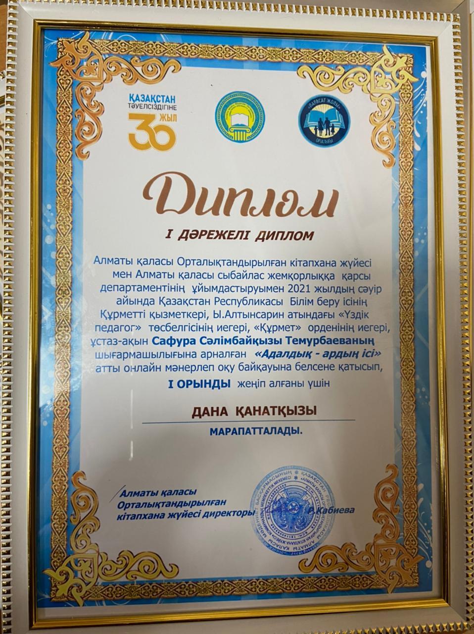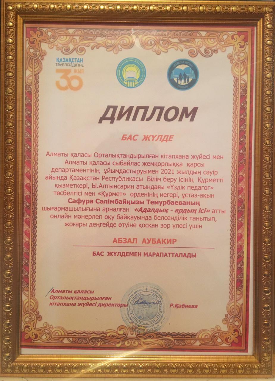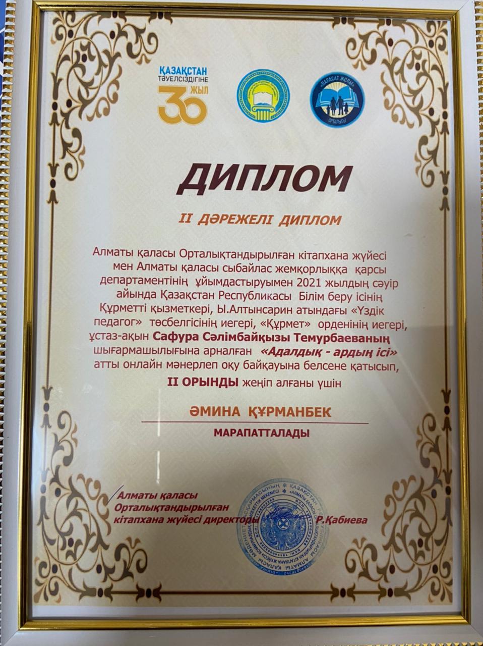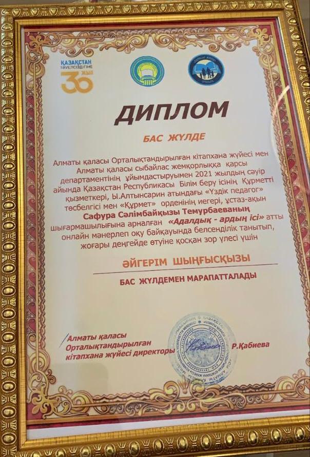 2021 жылдың сәуір айында Алматы қаласы Орталықтандырылған кітапхана жүйесі мен Алматы қаласы сыбайлас жемқорлыққа қарсы департаментінің ұйымдастыруымен, гимназиямыздың аяулы ұстазы, Қазақстан Республикасы Білім беру ісінің Құрметті қызметкері, Ы.Алтынсарин атындағы «Үздік педагог» төсбелгісі мен «Құрмет» орденінің иегері, ұстаз-ақын Сафура Сәлімбайқызы Темурбаеваның, шығармашылығына арналған «Адалдық – ардың ісі» атты онлайн мәнерлеп оқу байқауы ұйымдастырылды. Байқауға атсалысқан барша қатысушылардың марапаттарымен құттықтаймыз.