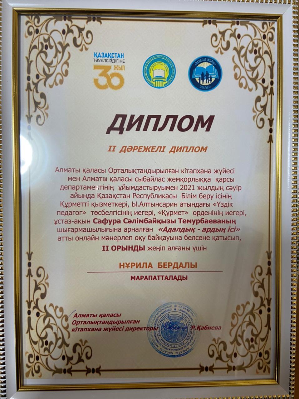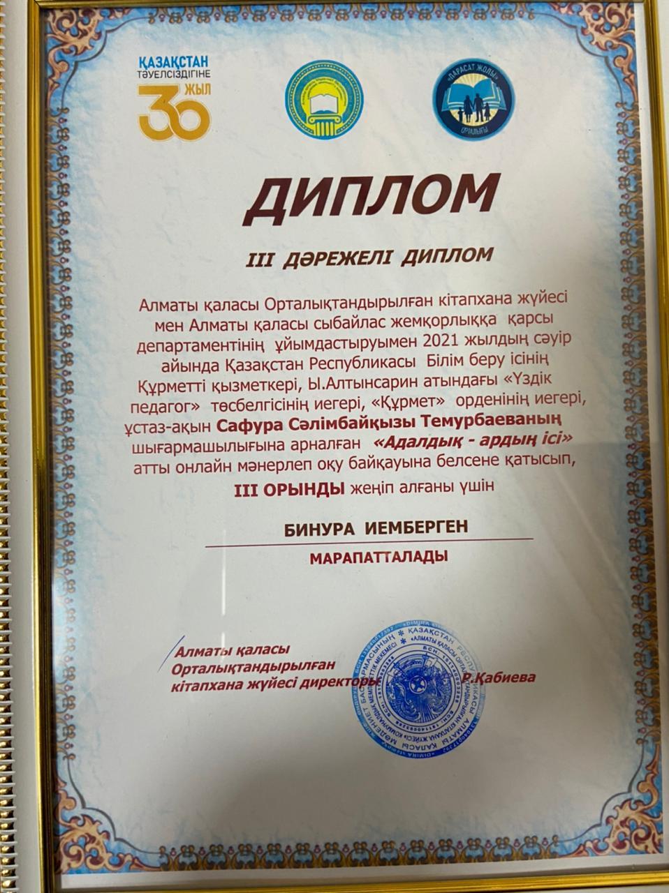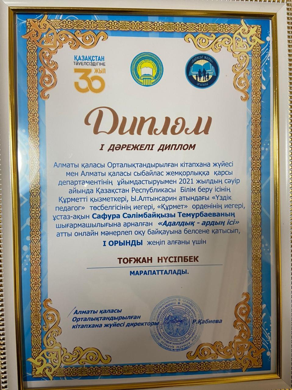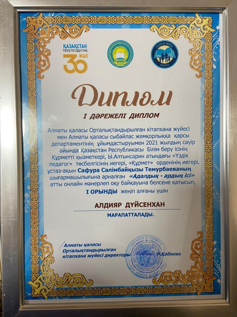 2021 жылдың сәуір айында Алматы қаласы Орталықтандырылған кітапхана жүйесі мен Алматы қаласы сыбайлас жемқорлыққа қарсы департаментінің ұйымдастыруымен, гимназиямыздың аяулы ұстазы, Қазақстан Республикасы Білім беру ісінің Құрметті қызметкері, Ы.Алтынсарин атындағы «Үздік педагог» төсбелгісі мен «Құрмет» орденінің иегері, ұстаз-ақын Сафура Сәлімбайқызы Темурбаеваның, шығармашылығына арналған «Адалдық – ардың ісі» атты онлайн мәнерлеп оқу байқауы ұйымдастырылды. Байқауға атсалысқан барша қатысушылардың марапаттарымен құттықтаймыз.