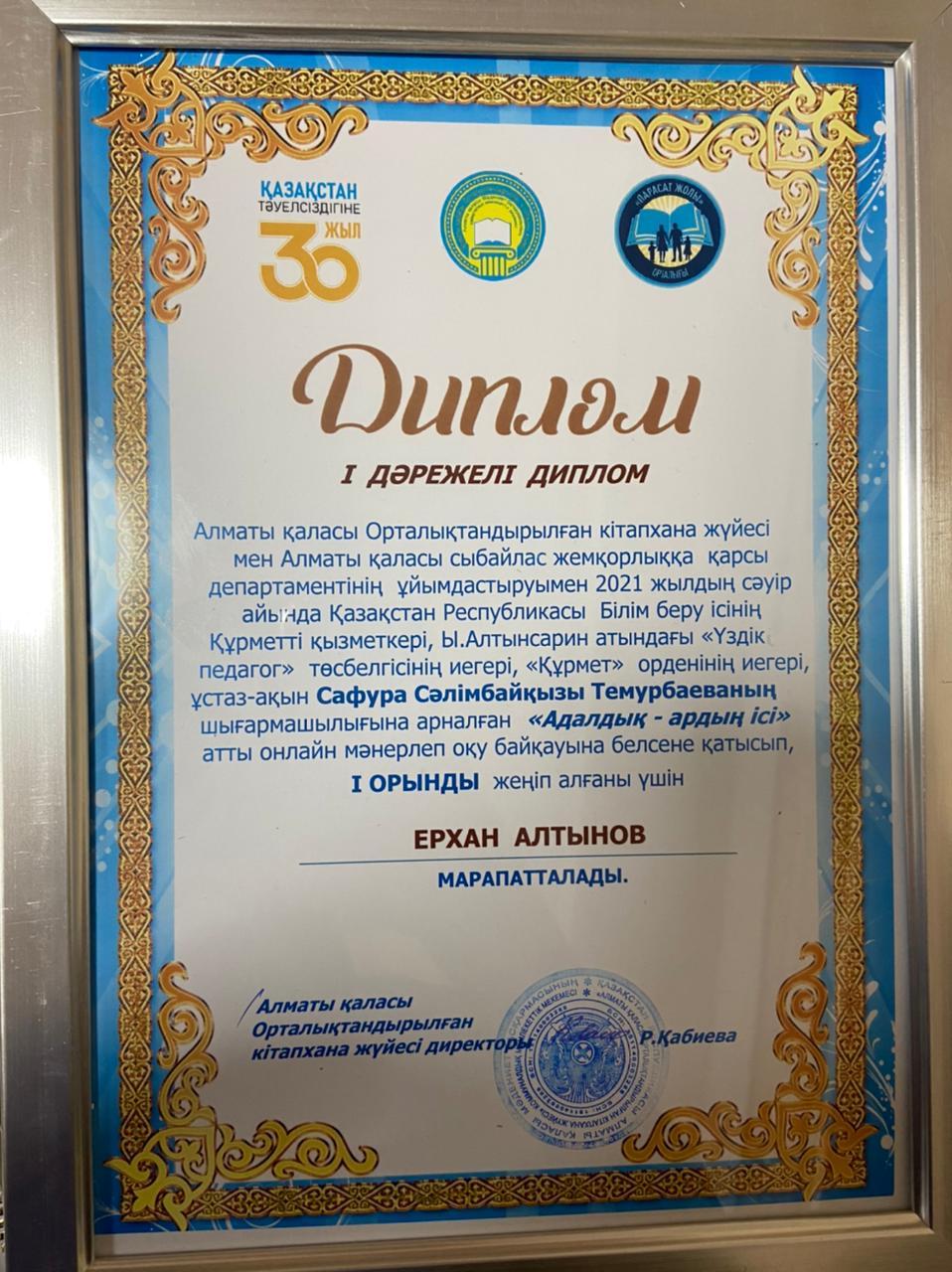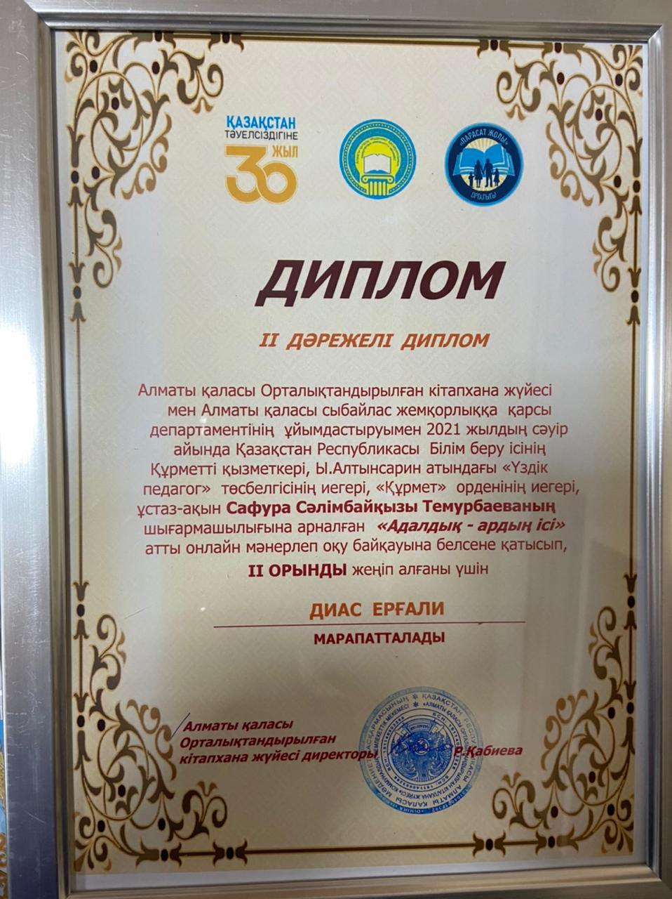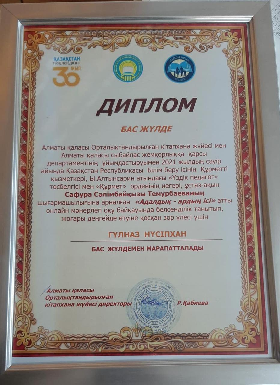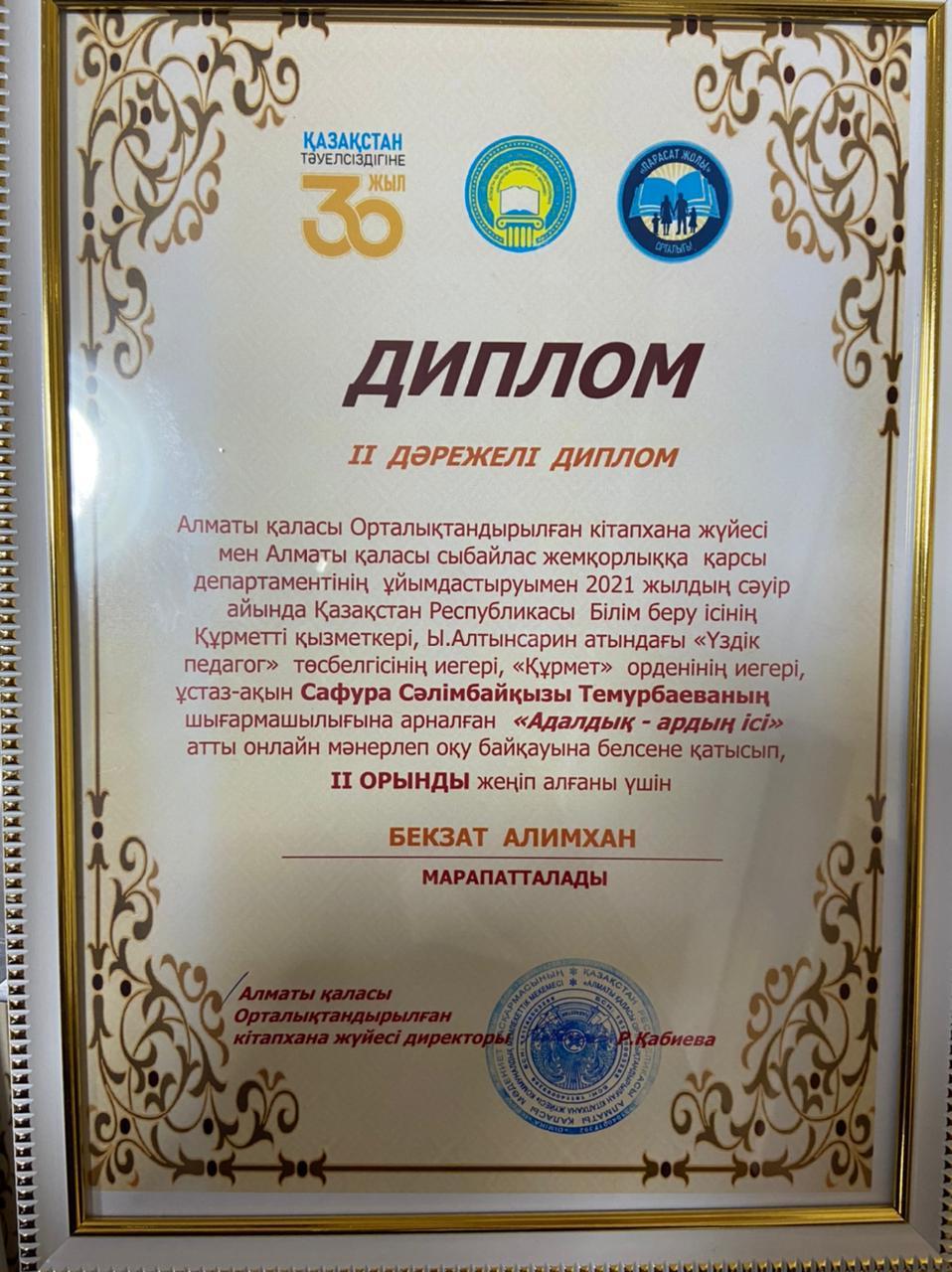 2021 жылдың сәуір айында Алматы қаласы Орталықтандырылған кітапхана жүйесі мен Алматы қаласы сыбайлас жемқорлыққа қарсы департаментінің ұйымдастыруымен, гимназиямыздың аяулы ұстазы, Қазақстан Республикасы Білім беру ісінің Құрметті қызметкері, Ы.Алтынсарин атындағы «Үздік педагог» төсбелгісі мен «Құрмет» орденінің иегері, ұстаз-ақын Сафура Сәлімбайқызы Темурбаеваның, шығармашылығына арналған «Адалдық – ардың ісі» атты онлайн мәнерлеп оқу байқауы ұйымдастырылды. Байқауға атсалысқан барша қатысушылардың марапаттарымен құттықтаймыз.