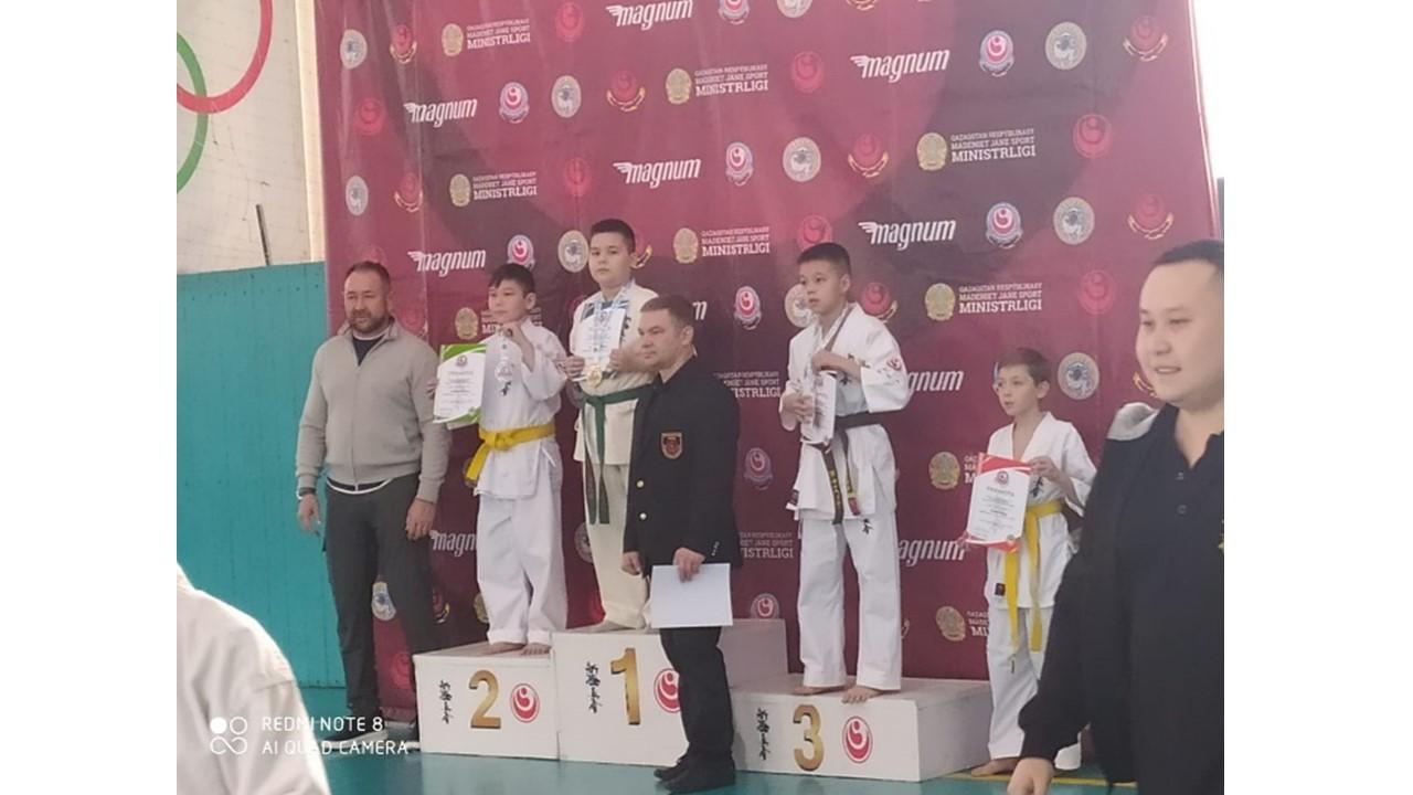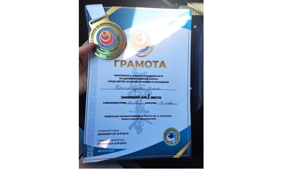 Б.Кабулов атындағы шинкиокушинкай каратэ федерацияның ұйымдастыруымен қараша айының жиырмасында өткен турнирде алтын алқа таққан гимназиямыздың 5 «Д» сынып оқушысы Талғатұлы Ілиясты жеңісімен құттықтаймыз! Бала жанынан табылып, қолдау көрсетіп келе жатқан ата-анасына айтар алғысымыз шексіз! Еліміздің көк туын әлемдік аренада желбірететініңе сенеміз!