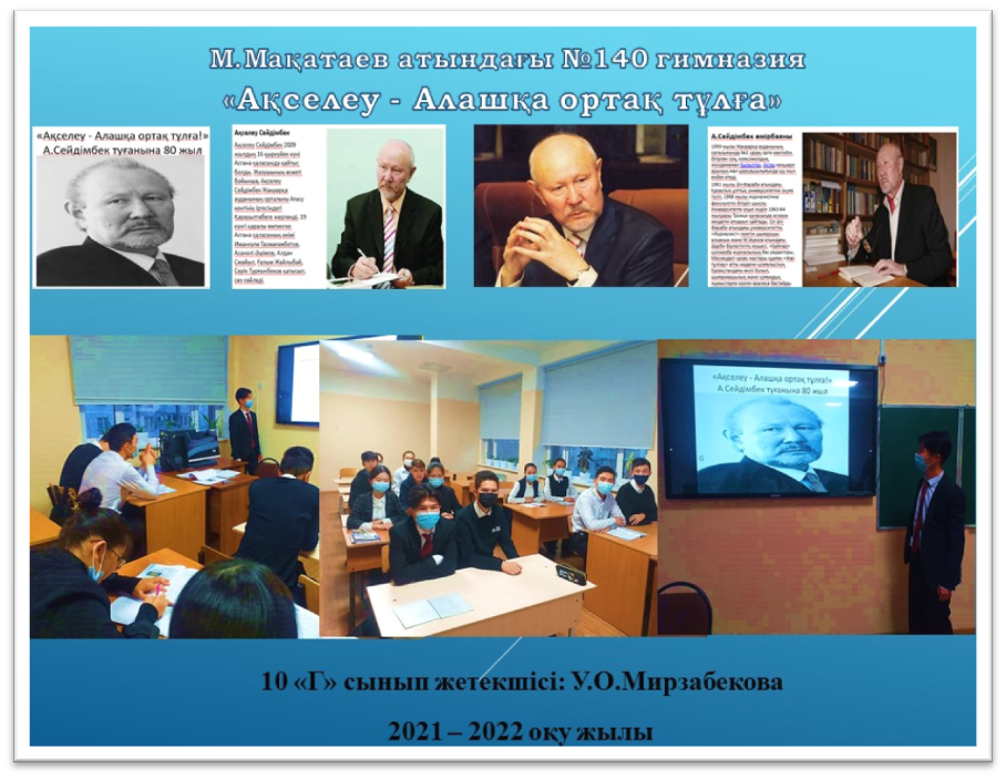 Саналы ғұмырын сахарасын зерттеуге арнап, ұлтының жоғын түгендеген Ақселеу Сейдімбектің биыл – 80 жылдығы. Ұлылықтың үлгісіндей болған Ақселеу Сейдімбек – халқымыздың өр рухының, өнегелі салтының, өрелі қалпының аса көрнекті өкілі еді. Туған халқын, оның төл тарихын, салт-дәстүрін, тілі мен ділін жан-тәнімен сүйіп, бойындағы тәңірі берген бар қабілет-дарыны мен қайрат-жігерін ұлт игілігіне арнаған үлкен парасат иесі бола білді. Осы орайда гимназиямыздың 10 «Г» сыныбы «Ақселеу Сейдімбек – 80 жыл» атты дөңгелек үстел ұйымдастырды.
