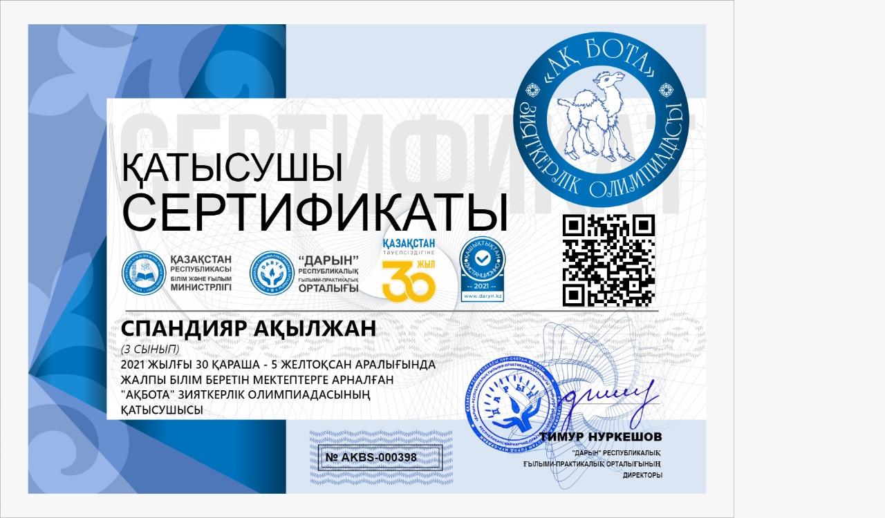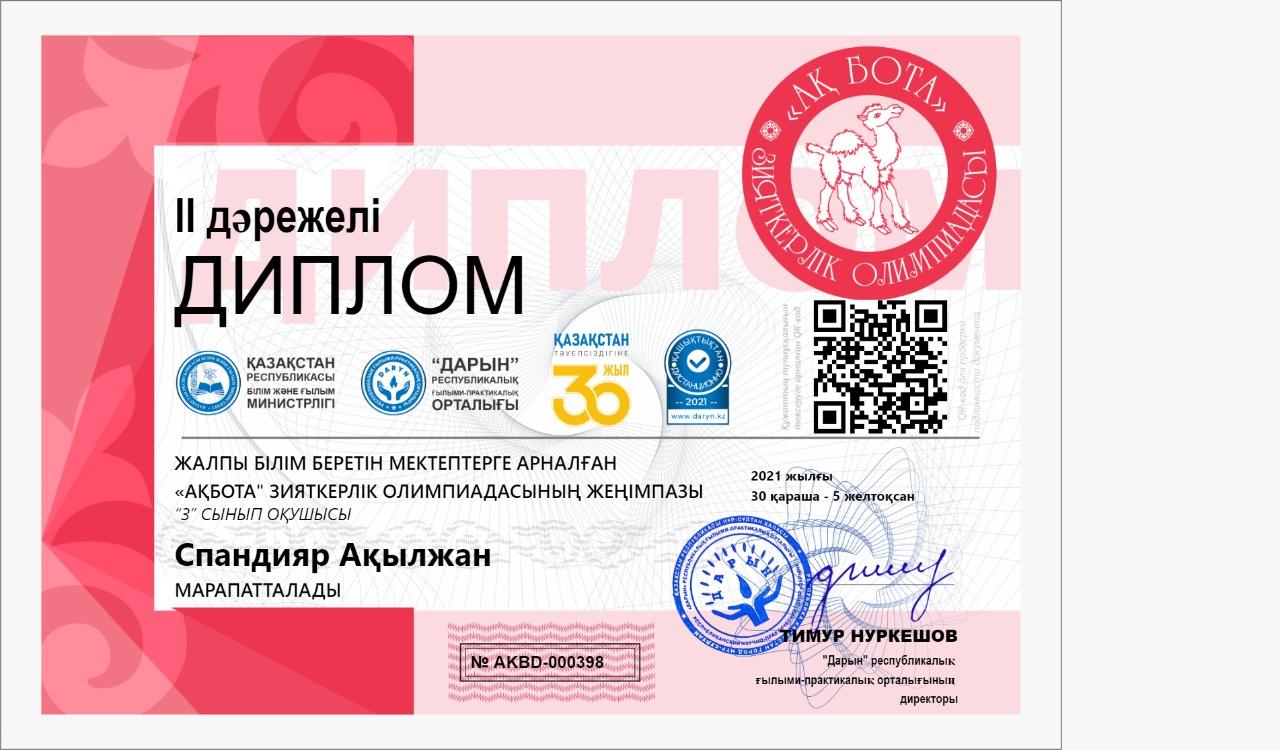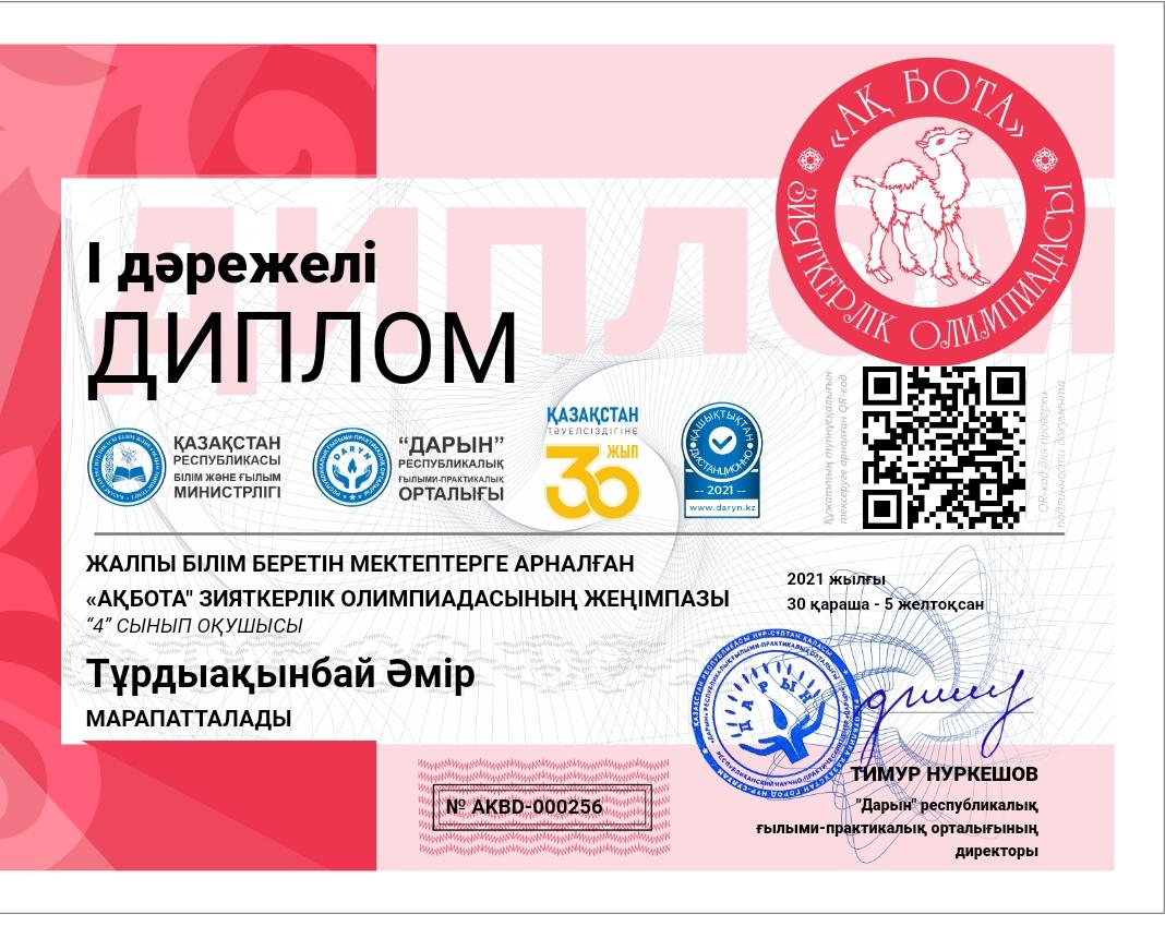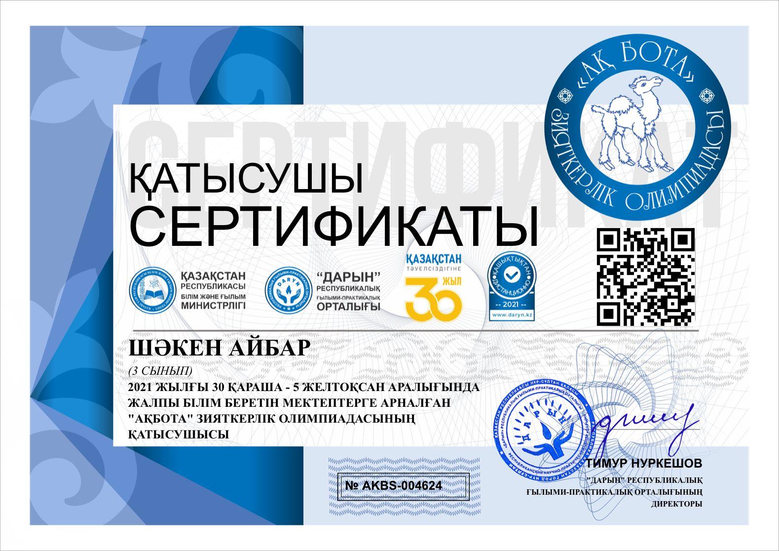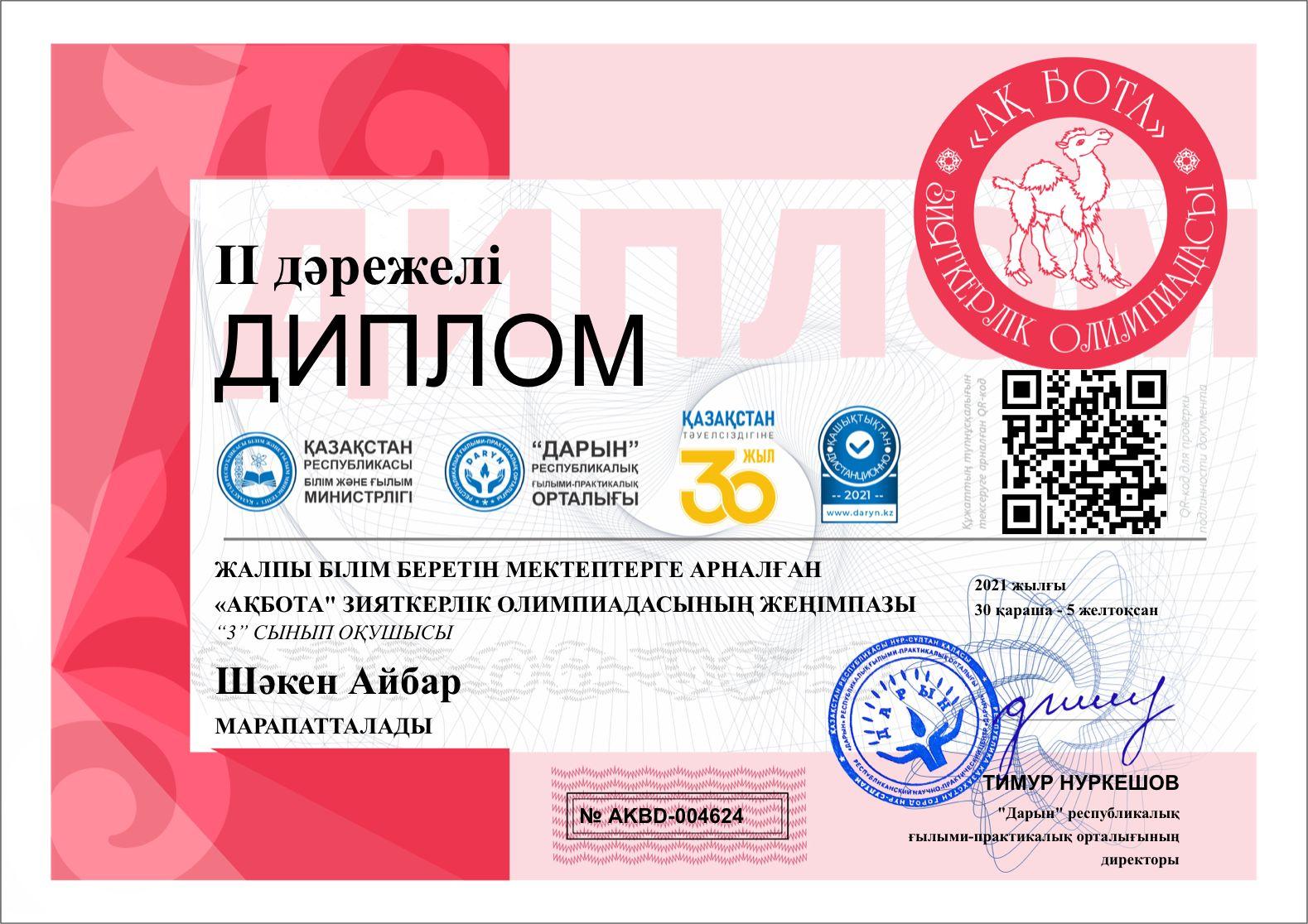 Елімізде «Дарын» Республикалық ғылыми-практикалық орталығының ұйымдастыруымен өтілетін «Ақ Бота» зияткерлік олимпиадасы биыл да өзінің дәстүрлі білім сайысын өткізді. 2021 жылғы 30 қараша мен 5-желтоқсан аралығында жалпы білім беретін мектептерге арналған «Ақбота» зияткерлік олимпиадасына гимназиямыздың бастауыш 3-4-сынып оқушылары қатысып, жүлделі орындарға ие болды. Талапты да зерек шәкірттерімізді шын жүректен құттықтаймыз.