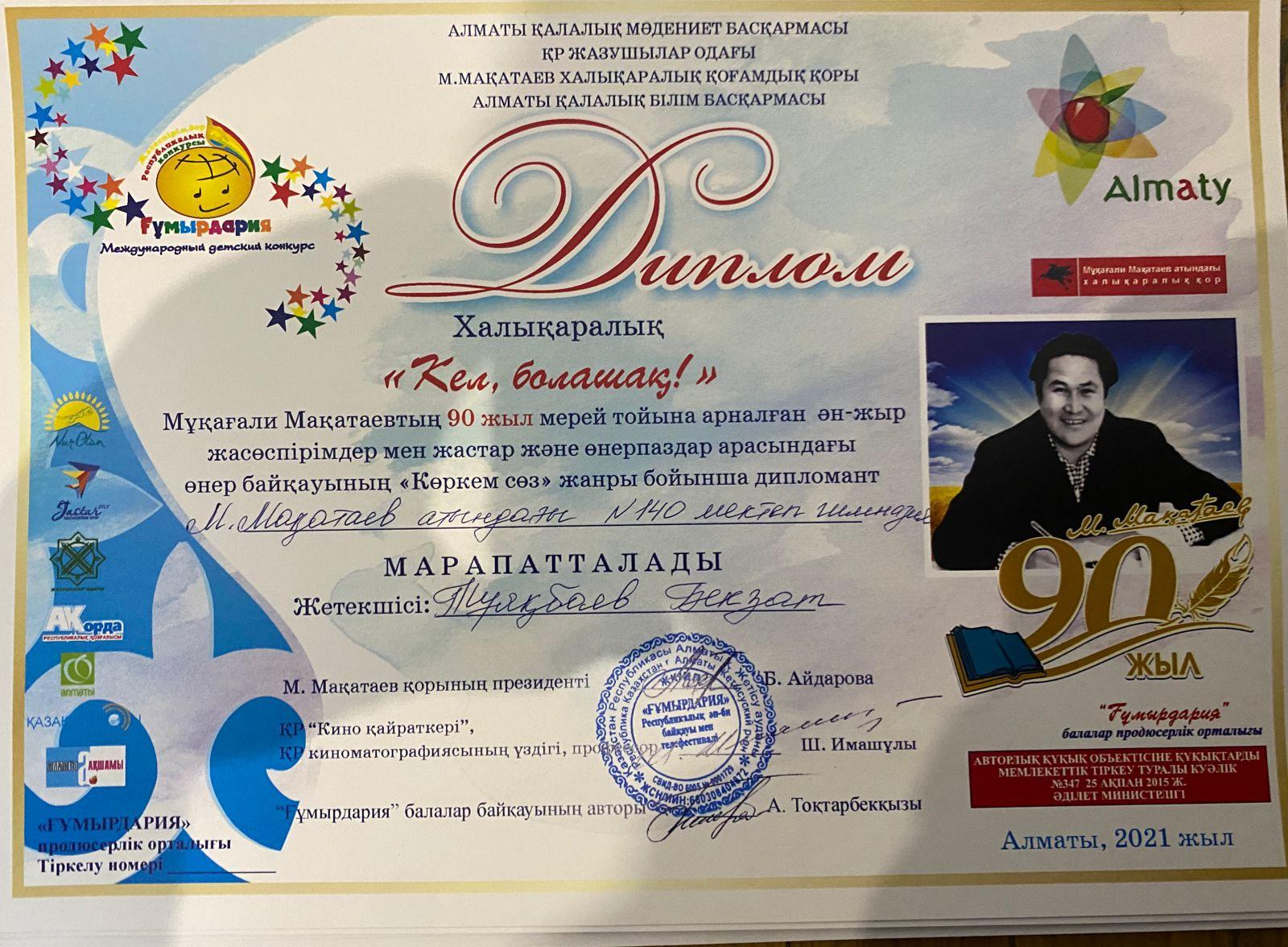 Алматы қаласының мәдениет басқармасы, ҚР жазушылар одағы, М.Мақатаев халықаралық қоғамдық қорының жауапкершілігімен ұйымдастырылған халықаралық «Кел болашақ» байқауында, «Көркем сөз» номинациясы бойынша өнер көрсеткен М.Мақатаев атындағы 140 гимназияның талапты шәкірттері үздік өнер көрсетіп, марапатталды. Талантты шәкірттеріміздің жетекшісі - Тұяқбаев Бекзат Мұхамедрайымұлы арнайы дипломмен марапатталды.