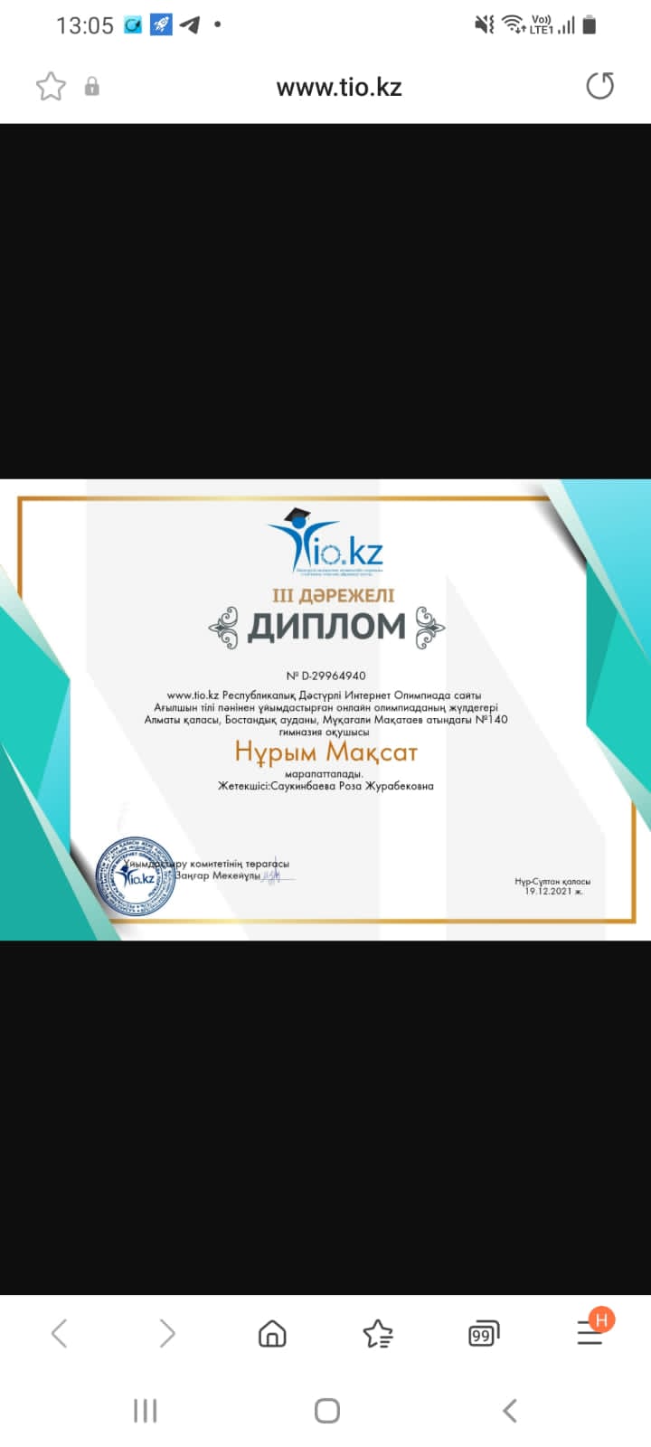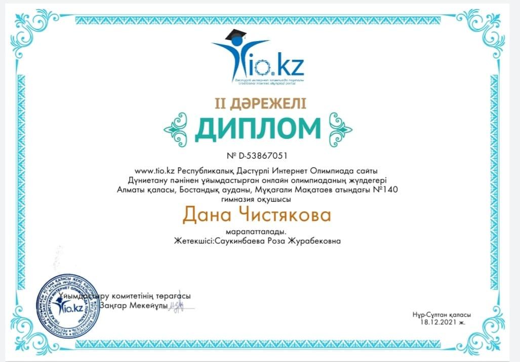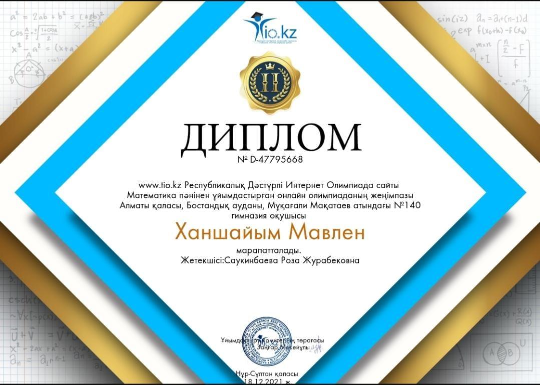 М. Мақатаев атындағы №140 гимназияның білікті ұстазы Саукинбаева Роза Журабековнаның жетекшілігімен Республикалық дәстүрлі дүниетанудан интернет олимпиадаға қатысып, ІІ дәрежелі орын алған Дана Чистякова мен ІІІ дәрежелі орын алған Бахытжан Айланды; Республикалық дәстүрлі математикадан интернет олимпиадаға қатысып, І дәрежелі орын алған Мавлен Ханшайымды, Республикалық дәстүрлі ағылшын тілі пәнінен интернет олимпиадаға қатысып, ІІІ дәрежелі орын алған Нұрым Мақсатты жеңістерімен құттықтаймыз!