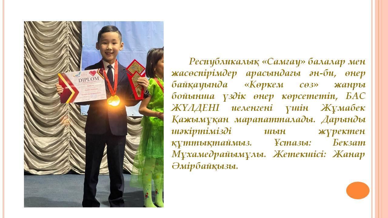 Республикалық «Самғау» балалар мен жасөспірімдер арасындағы ән-би, өнер байқауында «Көркем сөз» жанры бойынша үздік өнер көрсететіп, БАС ЖҮЛДЕНІ иеленгені үшін Жұмабек Қажымұқан марапатталады. Дарынды шәкіртімізді шын жүректен құттықтаймыз. Ұстазы: Бекзат Мұхамедрайымұлы. Жетекшісі: Жанар Әмірбайқызы.