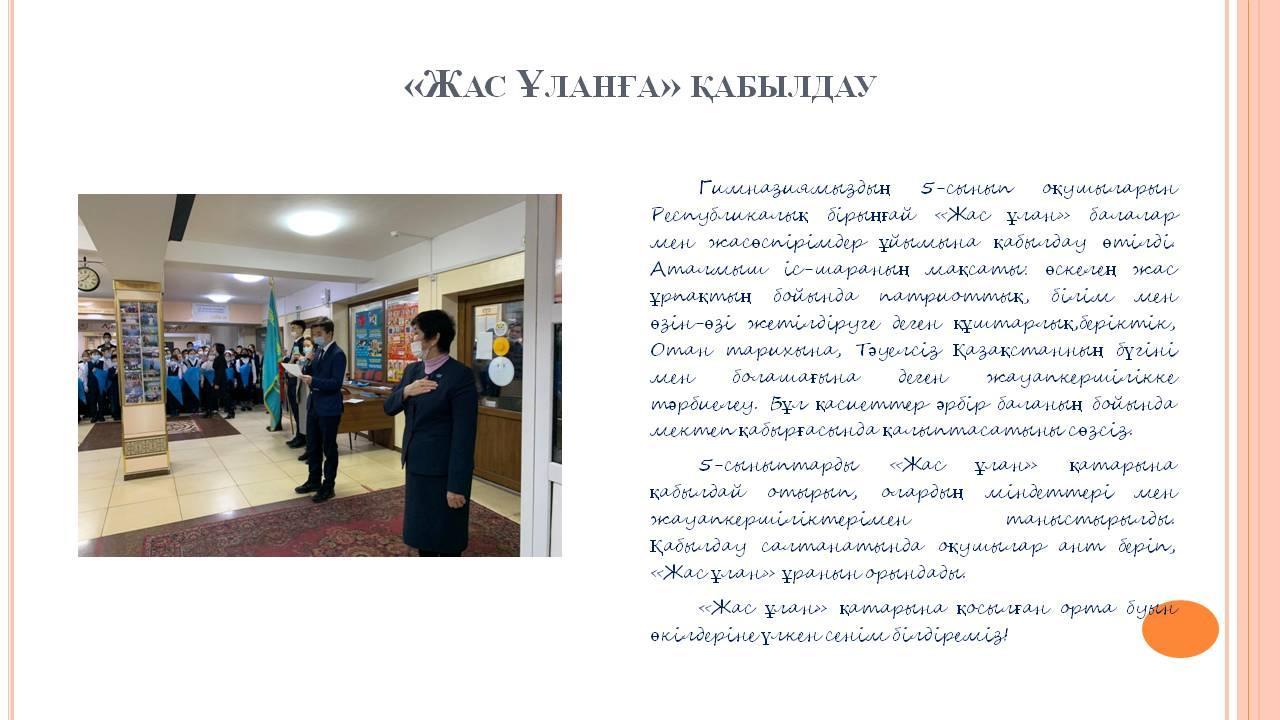 Гимназиямыздың 5-сынып оқушыларын Республикалық бірыңғай «Жас ұлан» балалар мен жасөспірімдер ұйымына қабылдау өтілді. Аталмыш іс-шараның мақсаты: өскелең жас ұрпақтың бойында патриоттық, білім мен өзін-өзі жетілдіруге деген құштарлық,беріктік, Отан тарихына, Тәуелсіз Қазақстанның бүгіні мен болашағына деген жауапкершілікке тәрбиелеу. Бұл қасиеттер әрбір баланың бойында мектеп қабырғасында қалыптасатыны сөзсіз. 5-сыныптарды «Жас ұлан» қатарына қабылдай отырып, олардың міндеттері мен жауапкершіліктерімен таныстырылды. Қабылдау салтанатында оқушылар ант беріп, «Жас ұлан» ұранын орындады. «Жас ұлан» қатарына қосылған орта буын өкілдеріне үлкен сенім білдіреміз!