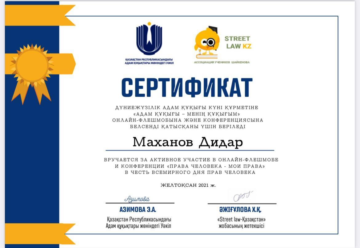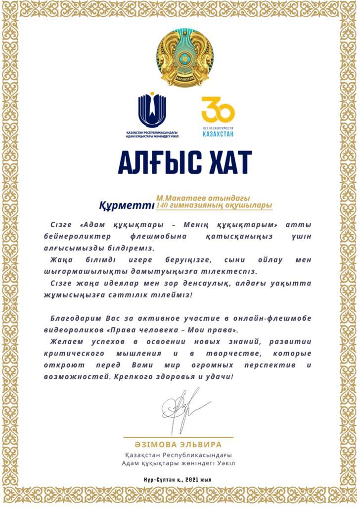 Адам құқығы – ең жоғары құндылық. Өзінің пікірін ашық білдіріп, қоғамда орнын қалыптастыратындай тұлға болып қалыптасуында құқықтың маңыздылығы жоғары. Осы орайда М.Мақатаев атындағы №140 гимназияның 8,9-сынып оқушылары Дүниежүзілік адам құқықтары мерекесі қарсаңында «Адам құқықтары – Менің құқықтарым» атты онлайн-флешмобына қатысты. Инстаграмм әлеуметтік желісіне видео жүктеу арқылы оқушылар мен студенттер арасында өткен онлайн-флешмоб тартысқа толы болып өтті. Нүсіпбек Тоғжан, Иемберген Бинура, Мейірқұл Алиби және Маханов Дидар Қазақстан Республикасының Адам құқықтары жөніндегі Уәкілінің Алғыс хаттарымен марапатталды.