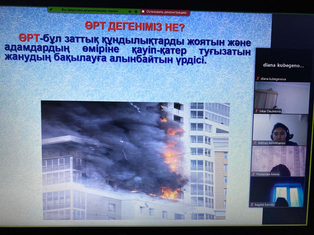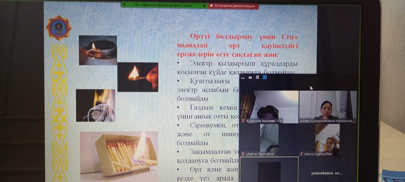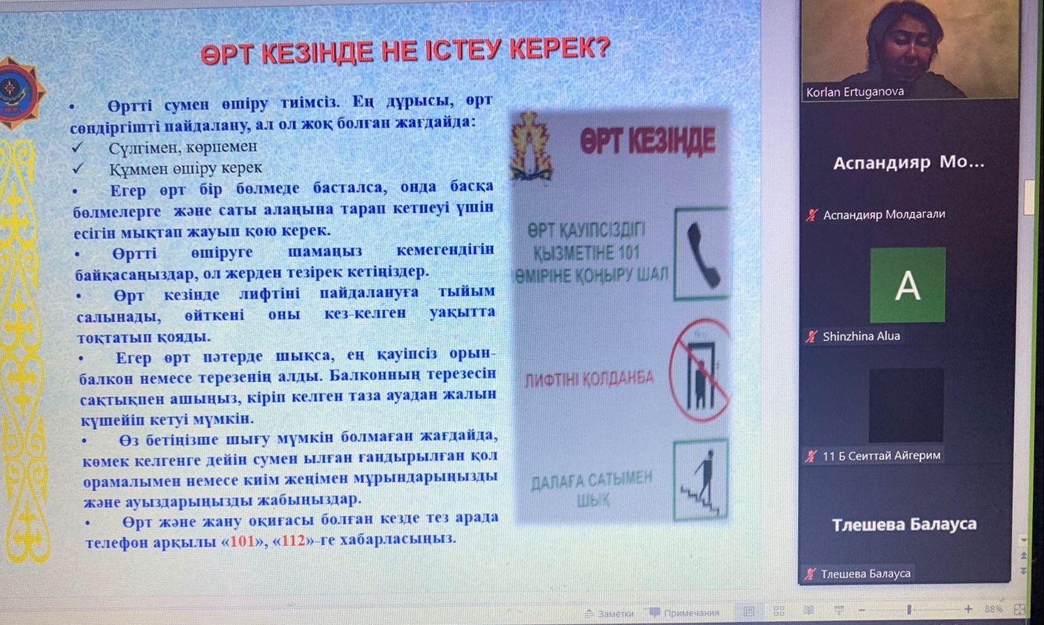 М.Мақатаев атындағы №140 гимназияда 05-07.02.2022 күндері өрттің қаншалықты қауіпті екені туралы балаларға түсіндірме жұмыстарын ұйымдастыру, білімдерін кеңейту, өрттің алдын алу мақсатында «Тұрғын үйдегі өрт қауіпсіздік ережелері» тақырыбында 1-11 сынып оқушыларына сынып сағаты өткізілді. Сынып сағаты барысында оттың тілсіз жау екендігі, оның зияны мен қауіпсіздігі туралы толық мағлұмат берілді. Балаларға оттан сақтанудың жолдарын, өрттің табиғатқа, адамға әкелетін зардабын түсіндіре отырып, сіріңке, оттық т. б. қатерлі нәрселерден аулақ болуға баулыды.