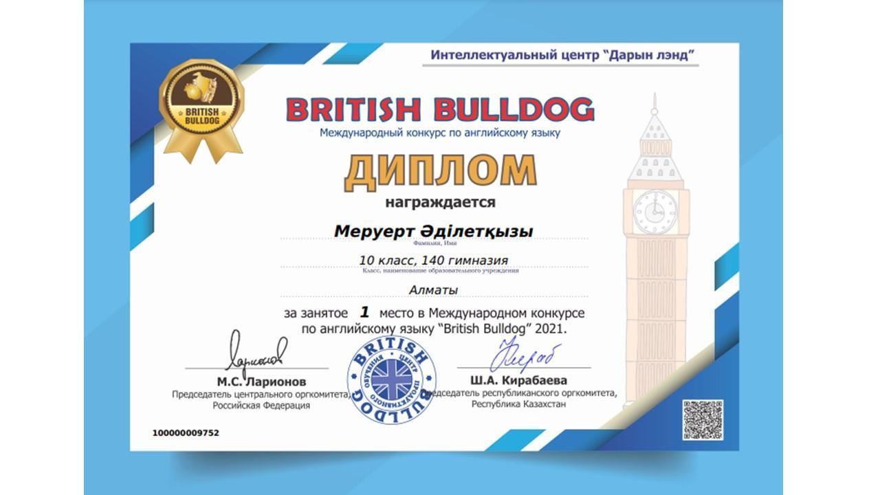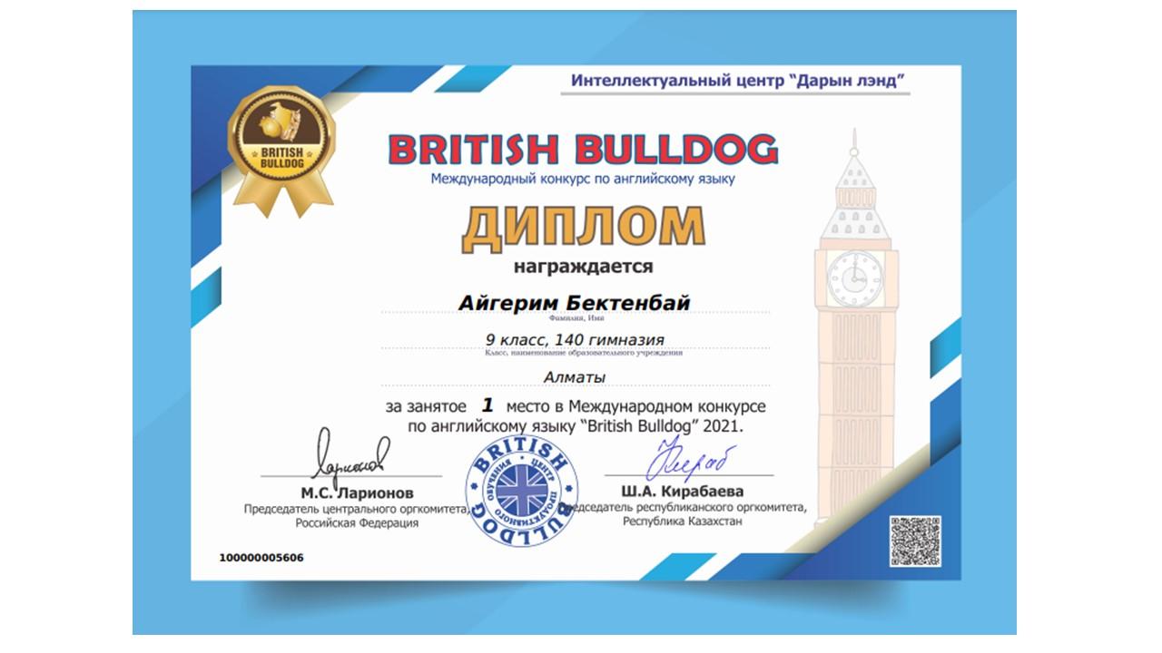 «Дарын лэнд» интеллектуалды орталығы ұйымдастырған ағылшын тілі бойынша «British Bulldog 2021» Халықаралық байқауында 1-орын алған М.Мақатаев атындағы №140 гимназияның 9-сынып оқушысы Бектенбай Айгерим мен 10-сынып оқушысы Әділетқызы Меруертті жүлделі жеңістерімен құттықтаймыз.