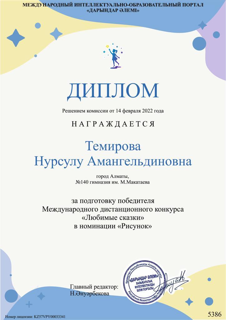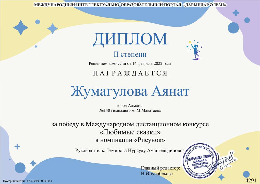 Халықаралық «Дарындар әлемі» интеллектуалды білім порталында өткізілген «Сүйікті ертегі» қашықтық байқауында «Сурет» номинациясы бойынша М.Мақатаев атындағы №140 гимназия шәкірті Жумагулова Аянат ІІ дәрежелі дипломмен марапатталды. Аянатты Халықаралық деңгейдегі байқауға дайындаған ұстазы Темирова Нурсулу Амангельдиновнаны жеңісімен құттықтаймыз.