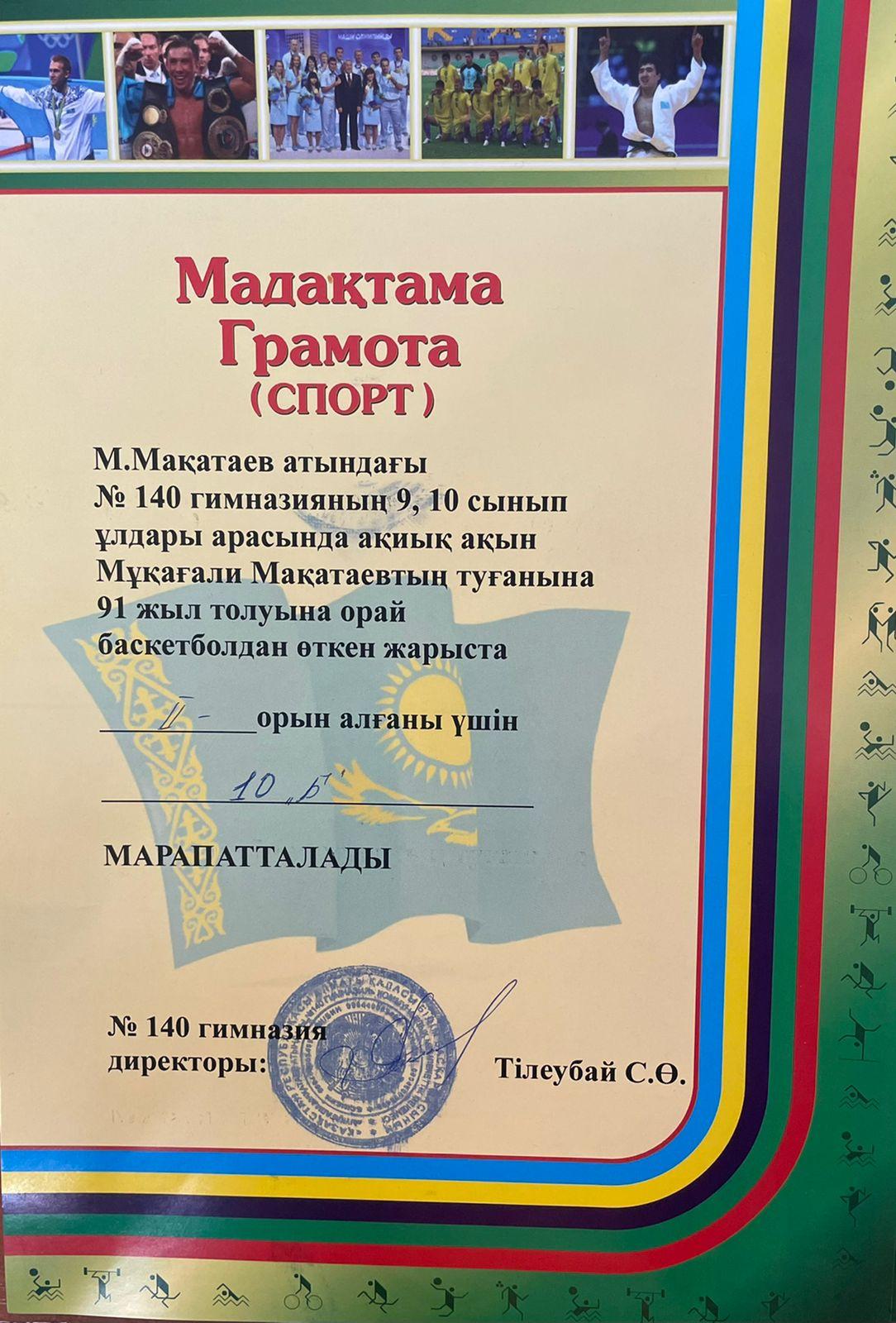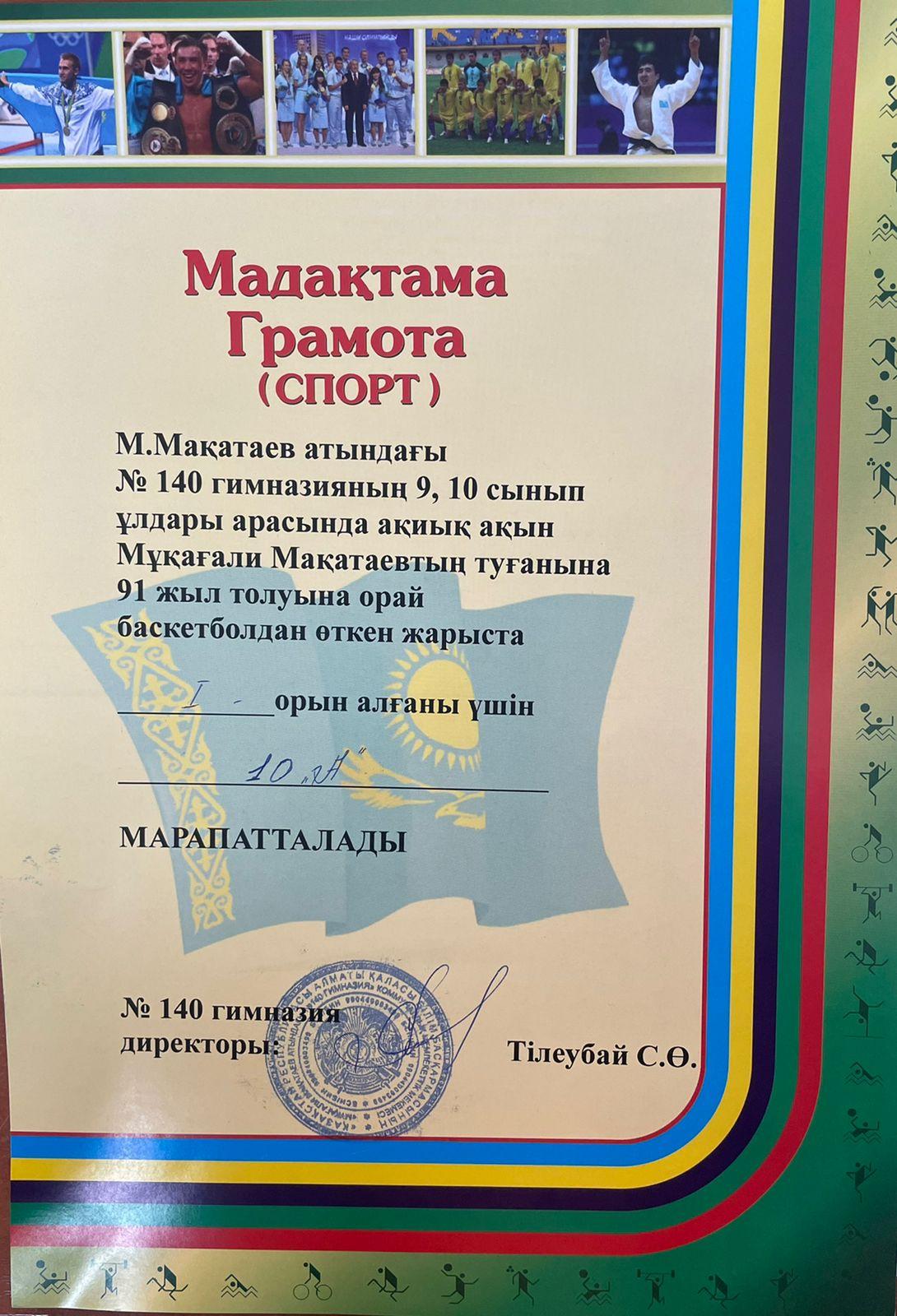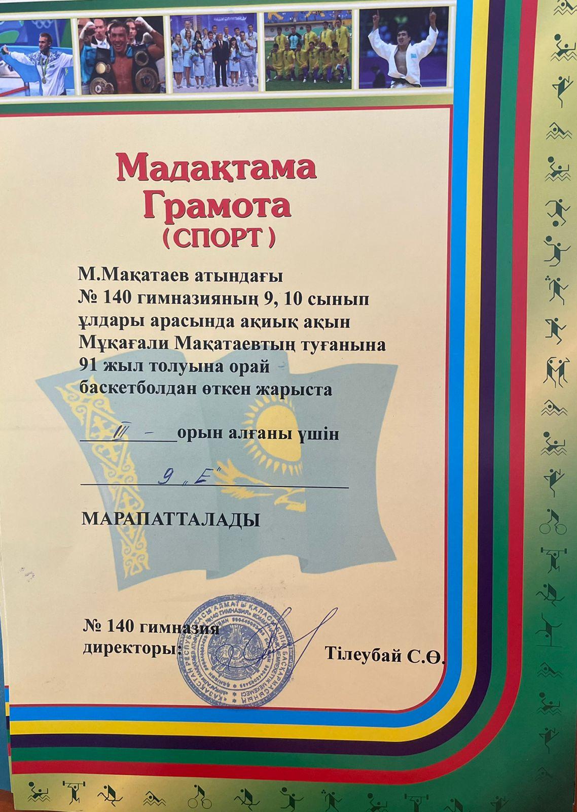 М.Мақатаев атындағы №140 гимназияның 9,10-сынып ұлдары арасында ақиық ақын М.Мақатаевтың туғанына 91 жыл толуына орай баскетболдан жарыс ұйымдастырылды. 45 оқушы топ-топ болып бақ сынаған жарыста І орынды 10 «А», ІІ орынды 10 «Б», ІІІ орынды 9 «Е» сыныптары иеленді. Шапшаңдығы мен шымырлығы үйлескен ұлдардың алдағы уақытта тек биік белестерді бағындыруына тілектеспіз. Шымыр әрі шыншыл болған жастарымыздың алар асулары мол болғай!
