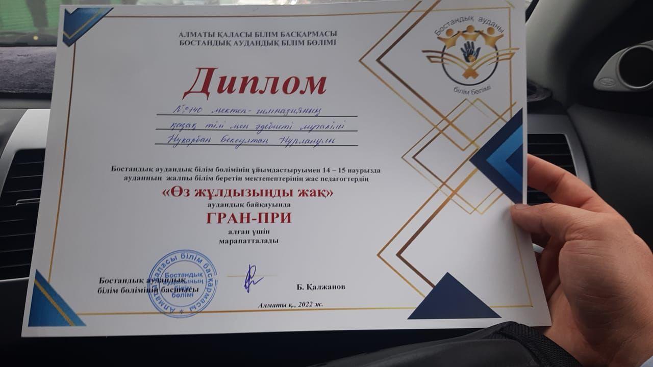 Бостандық ауданы білім бөлімінің ұйымдастыруымен 14-15 наурызда жалпы білім беретін мектептердің жас педагогтерінің арасында өткен «Өз жұлдызыңды жақ» аудандық байқауында ГРАН-ПРИ иегері атанған, М.Мақатаев атындағы №140 гимназияның қазақ тілі мен әдебиеті пәні мұғалімі – Нукарбан Бексұлтан Нұрланұлын жеңісімен құттықтай отырып, алда болатын қалалық байқауда асығының алшысынан түсуіне тілектеспіз. Қоржыныңыз жеңіспен майланып, жұлдызыңыз жарқырай берсін!!!